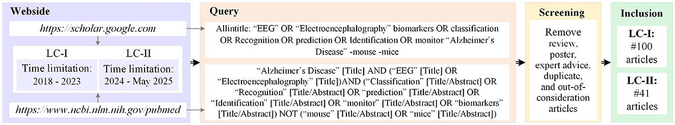 Figure 3. Preparation steps for literature screening: identification (Website, Query), screening, and inclusion. The process reduced LC-I from an initial total of 108 + 92 = 200 articles to 100 articles, and LC-II from 40 + 41 = 81 articles to 41 articles related to EEG and Alzheimer's disease.