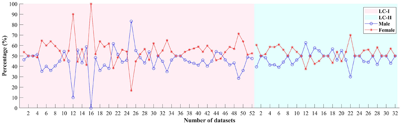 Some articles do not specify participant numbers by gender. This section summarizes the available data. Figure 4 illustrates the percentage of gender across datasets in LC-I and LC-II. The x-axis represents the dataset number, while the y-axis shows the percentage of participants in each dataset.
