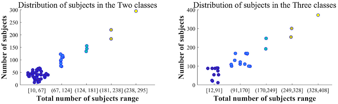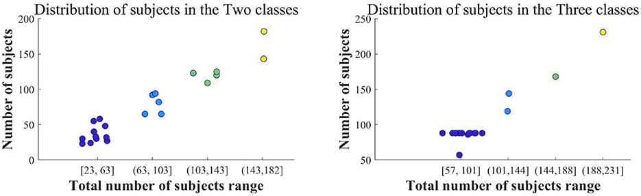 Figure 6 shows the gradient chart for the number of subjects in the Two class and Three class groups. It can be observed that the dataset for the two-class group, encompassing a total of 23 to 63 individuals, has been extensively studied. In the three-class study, the range of total subjects from 57 to 101 is given special attention. This data range is similar to that illustrated in LC-I. Therefore, in future research, the consideration of the number of subjects can be informed by this range.