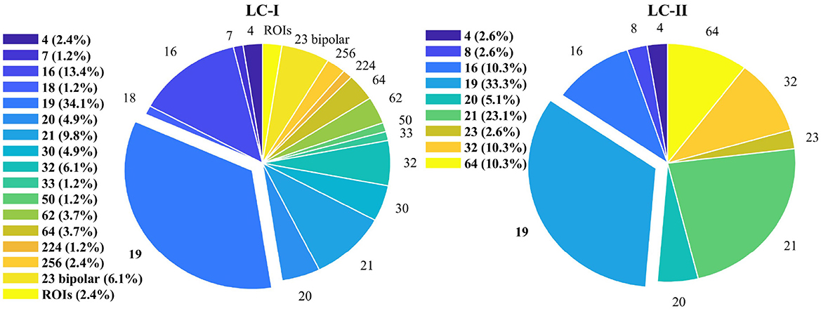 In LC-I, 82 articles specifically analyze channel configurations, with counts of 4, 7, 16, 18, 19, 20, 21, 30, 32, 33, 50, 62, 64, 224, 256, and 23 bipolar electrodes, along with some regions of interest (ROIs). Notably, the 19-channel and 21-channel setups are similar. The 21 channels include the 19 plus 2 reference electrodes (Al-Nuaimi et al., 2021). The 62-channel comprises 60 EEG and 2 EOG channels (Ding et al., 2022). The 18-channel literature refers to 16 and 2 reference electrodes (Yu et al., 2019). The distribution of articles by channel count is shown in the pie chart ratio on the left in Figure 7.