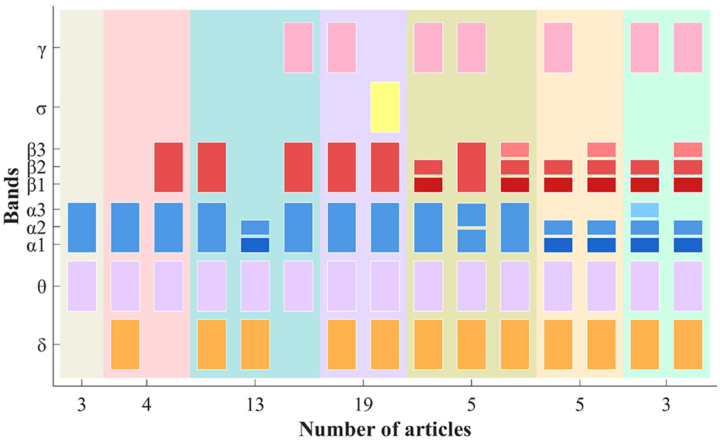 Figure 8. The main frequency band divisions and their corresponding number of articles in LC-I [the same background color indicates that the articles involve the same number of bands, while the horizontal axis represents the total number of articles. Additionally, one paper includes several cross-frequency data: δ (0.5–4 Hz), θ (4–8 Hz), α (8–12 Hz), low α (8–10 Hz), high α (10–12 Hz), β (12–30 Hz), δ-β (0.5–30 Hz), θ-β (4–30 Hz), and low γ (30–45 Hz)].