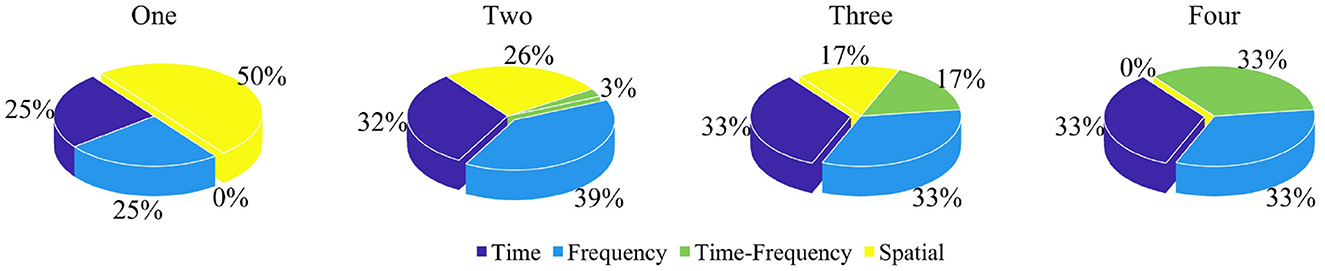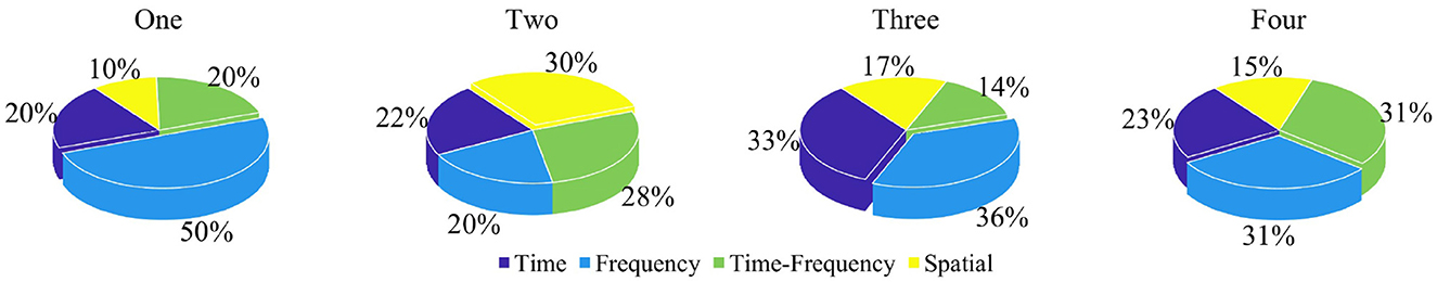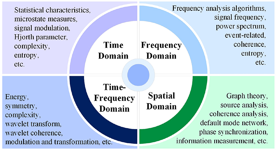 Time domain: The primary focus is on statistical feature extraction, with methods also capturing nonlinear features from time series data and analyzing microstate information (Lassi et al., 2023; Jiao et al., 2023). Frequency domain: Analysis emphasizes power and spectral characteristics, along with energy-related features. Time-frequency domain: Wavelet transform is dominant, with its derived features actively analyzed. Spatial domain: This field focuses on network analysis, encompassing functional connectivity, effective connectivity, and graph analysis. Additionally, analyses of coherence are also of interest.