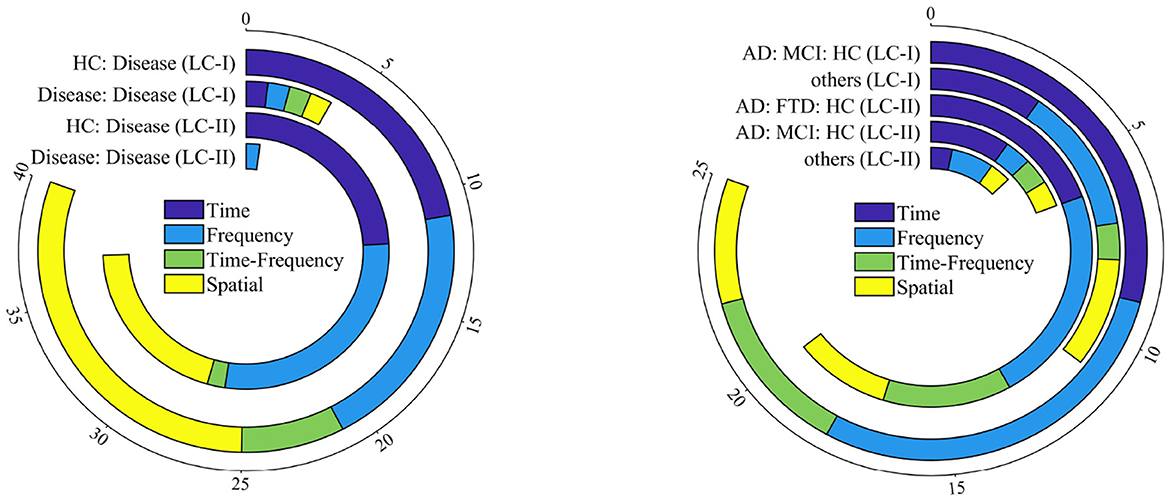 Similarities: In both literature sets, the study groups predominantly focus on Categories two, three, and four. Differences: In two classes of LC-I and LC-II, the former tends to combine AD with control groups, while the latter features a greater diversity in participant labeling across these categories. Additionally, LC-I includes research with combinations exceeding four categories, whereas LC-II examines a maximum of four categories (different types of dementia). Connections: In EEG data analysis of AD, one category typically involves follow-up analyses of AD progression. However, in clinical practice, follow-up requires substantial participant compliance. As research advances, Categories II and III are increasingly prioritized by researchers. Two-group categorical data are primarily utilized to analyze and identify potential biomarkers between HC and patients. In contrast, three or more groups generally focus on differentiation between HC and various dementia populations. While having more subjects enhances analysis, maintaining sample balance remains crucial.