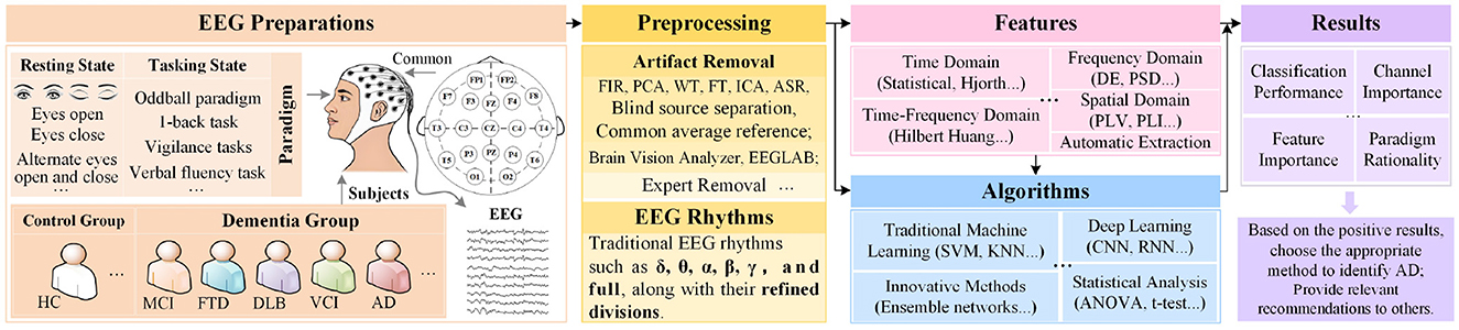 The preprocessing steps for AD-related EEG are consistent with those of a standard BCI system, showing no significant differences. In addition to traditional methods, several novel approaches have emerged in recent years. For instance, the Harvard Automated Processing Pipeline for EEG (HAPPE) is a processing method that integrates multiple algorithms, involving a two-step ICA approach. This includes wavelet-enhanced ICA for artifact removal and ICA decomposition, combined with a multi-artifact suppression algorithm to enhance the effectiveness of artifact removal. There is anticipation for the introduction of more innovative, integrated automatic artifact removal algorithms.