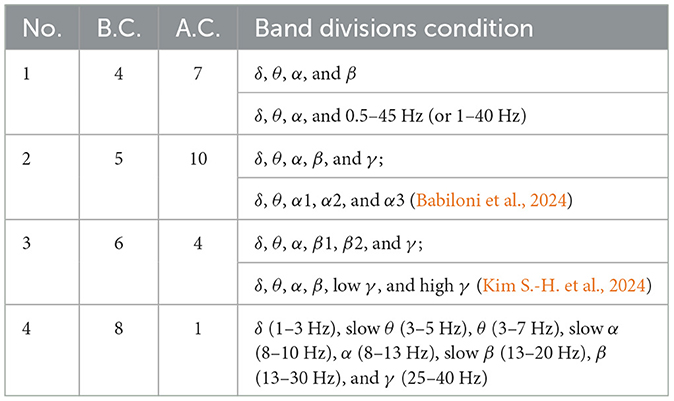 In LC-II, 18 articles discuss EEG data filtering, while 5 articles provide filtering ranges without detailing band name: 0.5–45 Hz (Rostamikia et al., 2024; Lal et al., 2024), 0.1–41 Hz (Yu et al., 2024), 0.1–100 Hz (Yan et al., 2024), and 8–30 Hz (Mohammed, 2024). Furthermore, the EEG frequency band divisions in LC-I already cover the main cases. The more detailed band divisions in LC-II are encompassed within LC-I. To highlight recent areas of interest, this section will present a table showcasing the combinations of frequency band divisions in LC-II along with the corresponding number of articles. The frequency band combinations for the related article counts (A.C.) are detailed in Table 2.