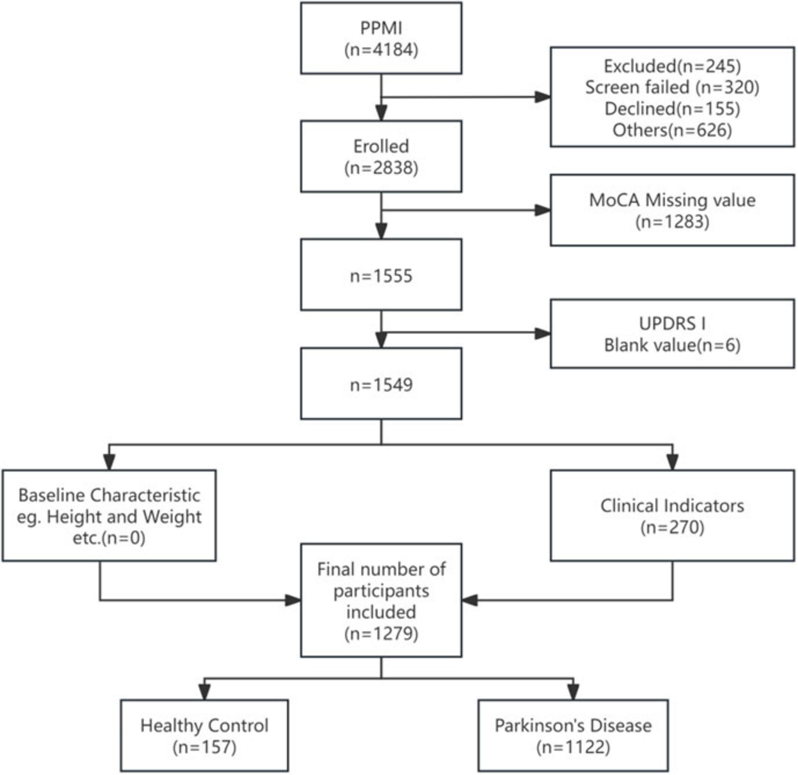 The study analyzed two distinct cohorts: the discovery cohort derived from PPMI (n = 1,279) and an external validation cohort from FAHHAUST-PD (n = 197). Participant screening for the discovery cohort began with 4,184 individuals in the PPMI database. After applying exclusion criteria—including severe comorbidities (n = 245), loss to follow-up (n = 320), non-Parkinson’s diagnoses (n = 155), and incomplete data for MoCA (n = 1,283), UPDRS-I (n = 6), or clinical biomarkers (n = 270)—1,279 participants were retained for analysis, comprising 1,122 Parkinson’s disease patients and 157 healthy controls in Figure 1. The 1,279 participants (PD + healthy controls) were included in model training to establish a baseline discriminative framework between PD-CI and “non-impaired groups” (including PD-non-CI and healthy controls).