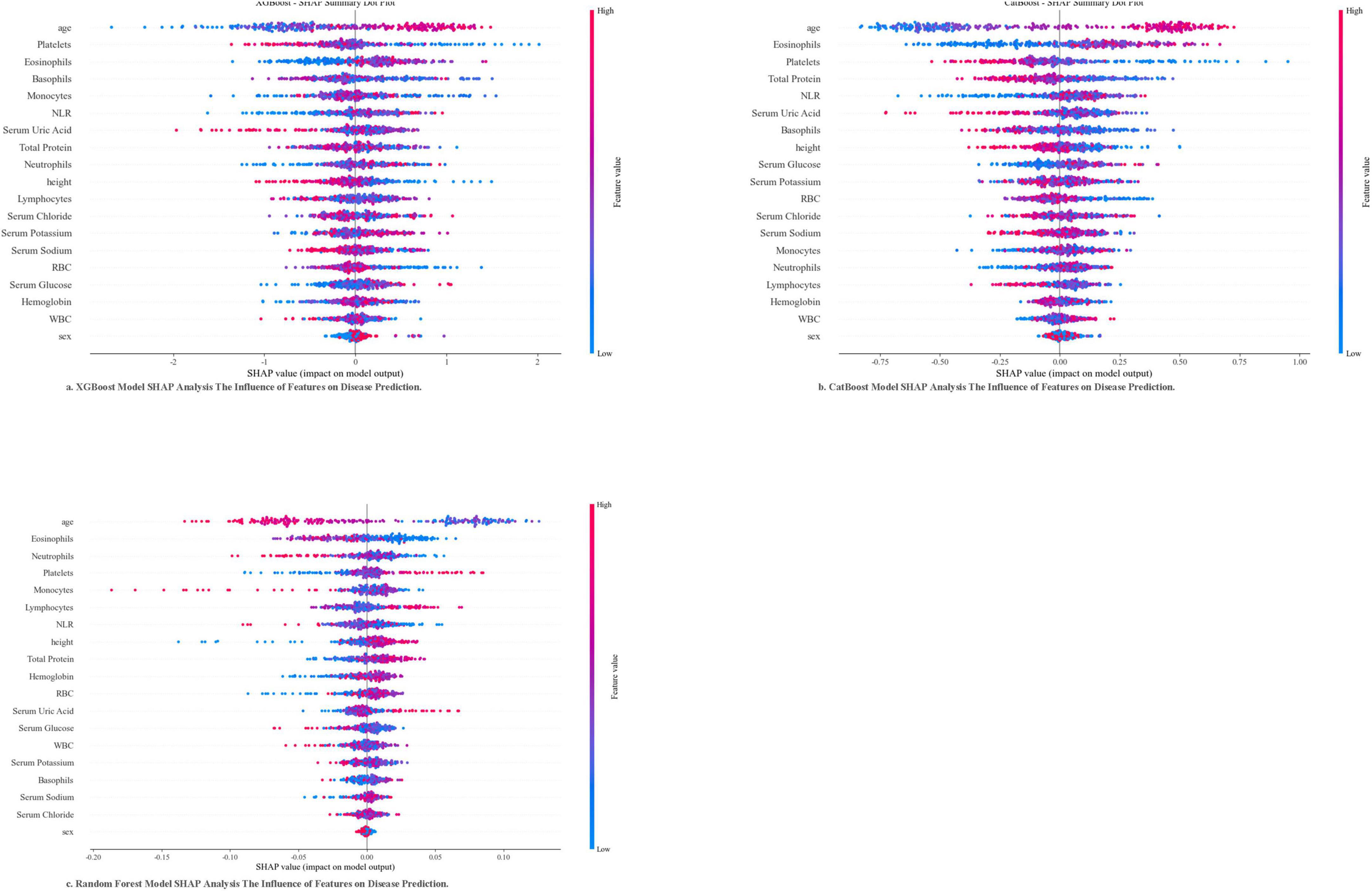 Figure 3. SHAP analysis of XGBoost models, CatBoost models, and Random forest models: the impact of features on disease prediction.