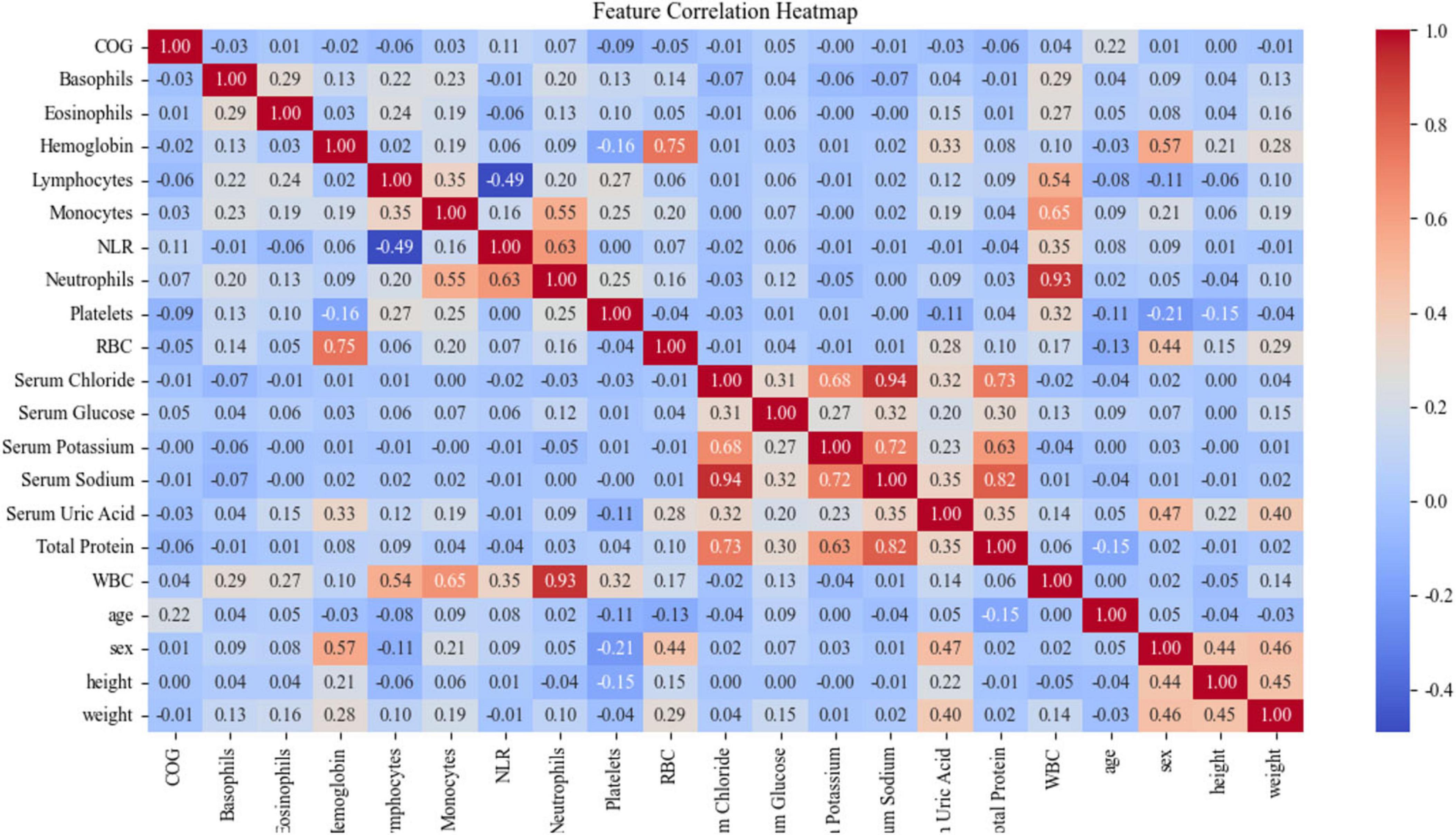 Pearson correlation analysis (Figure 4) revealed expected biological associations—white blood cells (WBC) strongly correlated with neutrophils (r = 0.93) and moderately with lymphocytes (r = 0.35). Clinically plausible relationships included the serum uric acid–total protein axis (r = 0.35) and gender-hemoglobin linkage (r = 0.57). Notable exceptions requiring clinical scrutiny were the unexpectedly strong chloride–total protein correlation (r = 0.73) and the cognitive score’s independence from physiological parameters (|r| < 0.22). Hierarchical clustering identified three biomarker clusters: (1) inflammatory mediators (NLR, WBC subsets), (2) metabolic regulators (serum electrolytes, uric acid), and (3) hematologic indices (hemoglobin, RBC), guiding subsequent multicollinearity mitigation strategies.