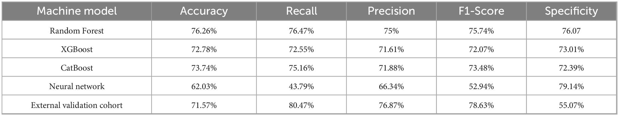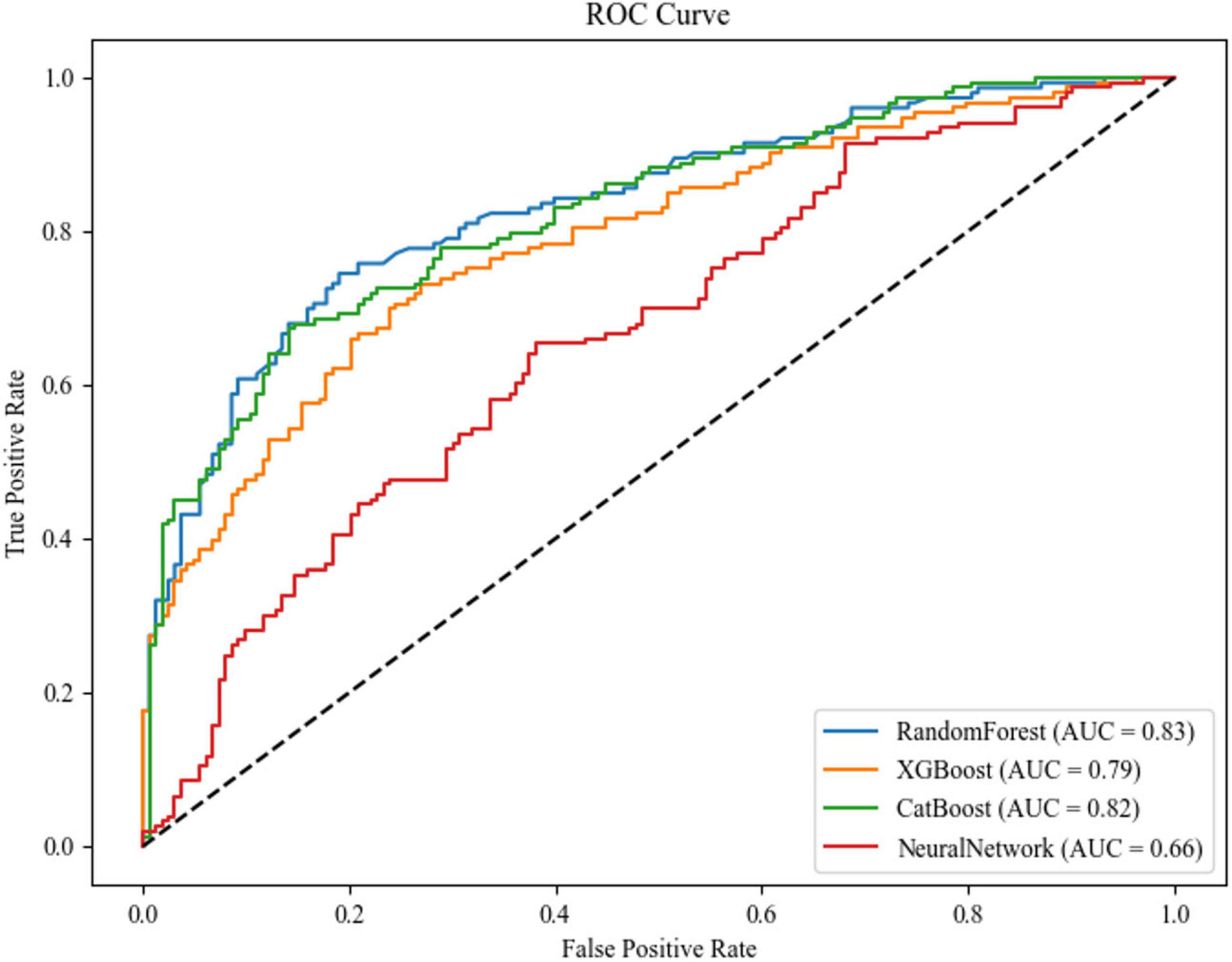 The comparative performance analysis of four machine learning architectures revealed distinct discriminatory capabilities in predicting Parkinson’s disease-associated cognitive impairment (Figure 5). Random Forest (AUC = 0.83, 95% CI [0.802, 0.858]) and CatBoost (AUC = 0.82, 95% CI [0.791, 0.849]) demonstrated superior diagnostic accuracy. XGBoost exhibited moderate performance (AUC = 0.79, 95% CI [0.759, 0.821]), while the neural network architecture underperformed (AUC = 0.66, 95% CI [0.623, 0.697]).