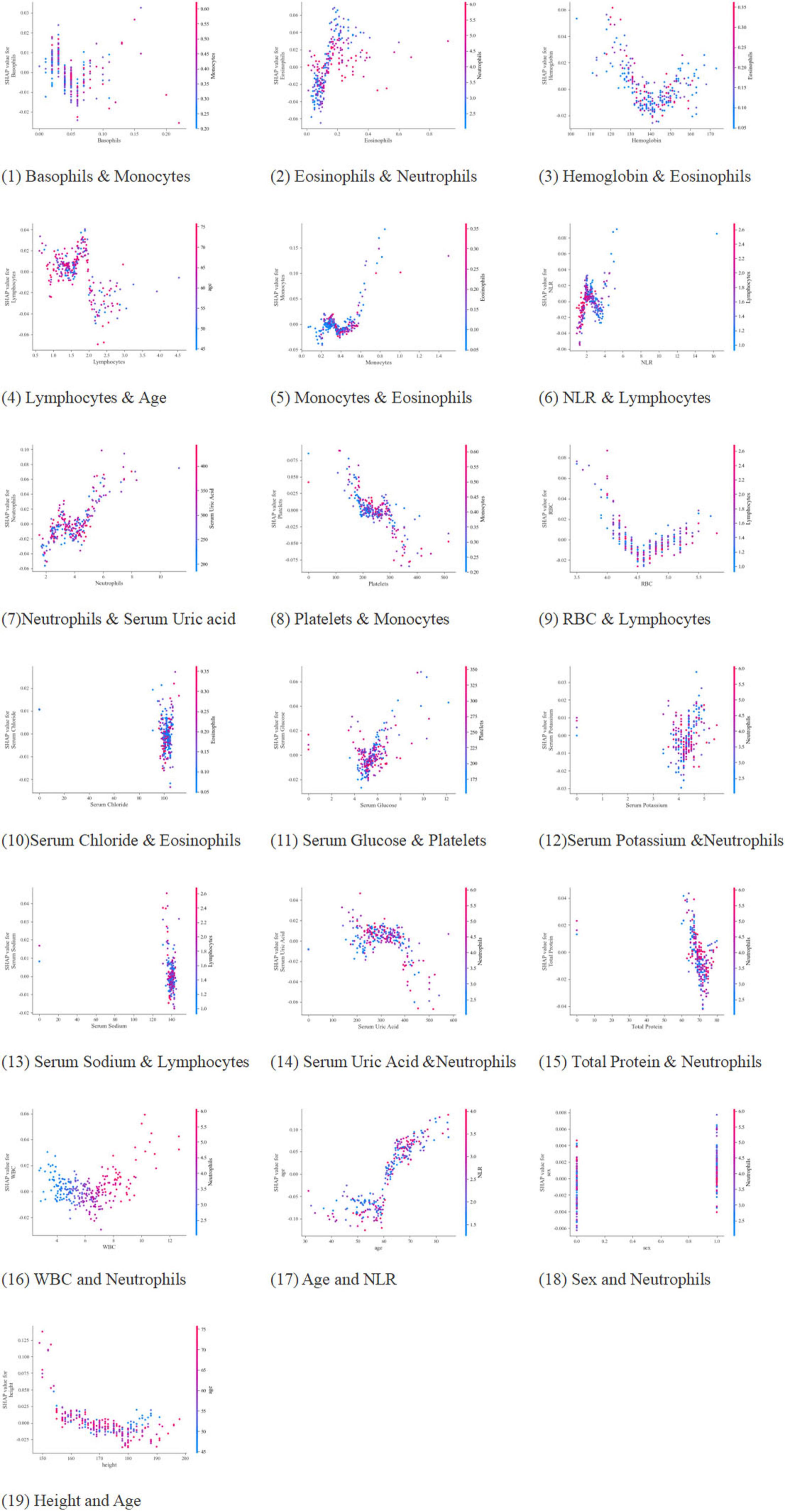 Figure 7. The contribution of multi-dimensional features to the prediction model (1–19). (1) Basophils and monocytes; (2) eosinophils and neutrophils; (3) hemoglobin and eosinophils; (4) lymphocytes and age; (5) monocytes and eosinophils; (6) NLR and lymphocytes; (7) neutrophils and serum uric acid; (8) platelets and monocytes; (9) RBC and lymphocytes; (10) serum chloride and eosinophils; (11) serum glucose and platelets; (12) serum potassium and neutrophils; (13) serum sodium and lymphocytes; (14) serum uric acid and neutrophils; (15) total protein and neutrophils; (16) WBC and neutrophils; (17) age and NLR; (18) sex and neutrophils; (19) height and age.