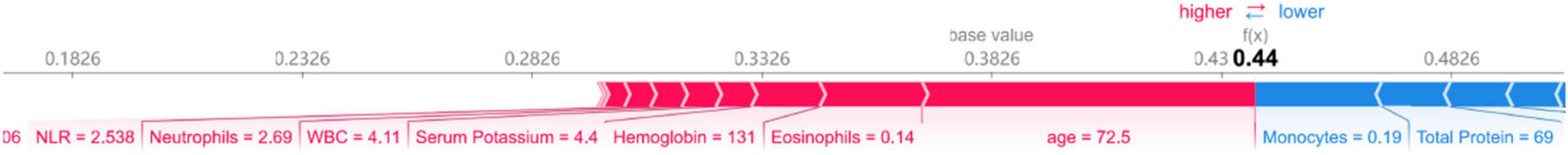 In a representative prediction scenario (Figure 8), a 72.5-year-old female patient with the following parameters: basophils = 0.02, eosinophils = 0.14, hemoglobin = 131, lymphocytes = 1.06, monocytes = 0.19, NLR = 2.54, neutrophils = 2.69, platelets = 193, RBC = 4.3, serum chloride = 160, serum glucose = 4.8, serum potassium = 4.4, serum sodium = 141, serum uric acid = 274, total protein = 69, WBC = 4.11, sex = 0, height = 168, weight = 71.8, had a cognitive impairment probability of 0.44. Age and eosinophils increased risk, while monocytes reduced risk.