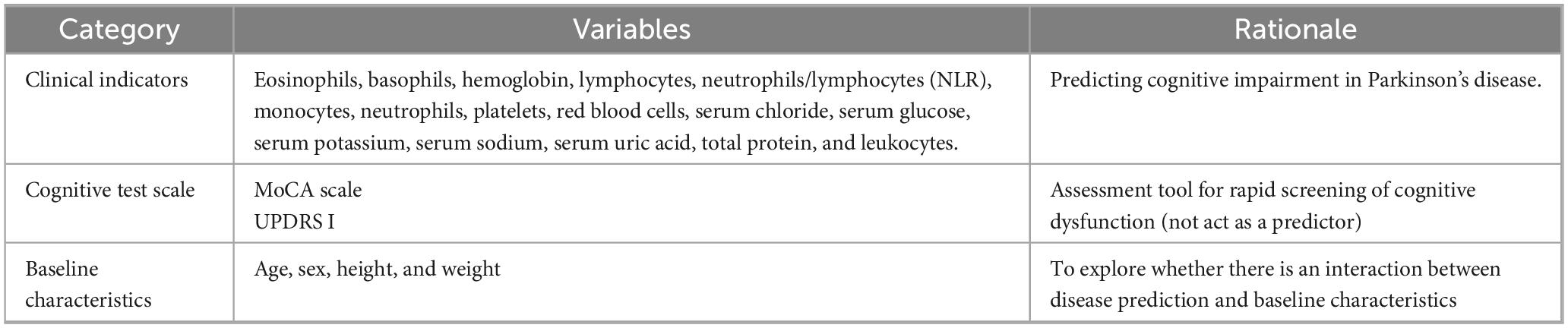 All data were obtained from the Parkinson’s Progression Markers Initiative (PPMI) database1, an ongoing international multicenter longitudinal cohort study. It should be noted that although the PPMI cohort involves participants from multiple countries, it is predominantly composed of White individuals, with relatively limited representation of Asian populations (Parkinson Progression Marker Initiative, 2011). All participating centers received approval from their respective Institutional Review Boards (IRB), with adherence to the ethical principles outlined in the Declaration of Helsinki (World Medical Association, 2013). The inclusion criteria were: (1) Diagnosis of Parkinson’s disease according to the International Parkinson and Movement Disorder Society (MDS) clinical diagnostic criteria (Postuma et al., 2015); (2) Age ≥18 years with full legal capacity; (3) Completion of baseline clinical assessments, including hematological profiles (e.g., neutrophil-to-lymphocyte ratio), neuropsychological evaluations (Montreal Cognitive Assessment, MoCA) (Nasreddine et al., 2005) and Part I of the Unified Parkinson’s Disease Rating Scale (UPDRS-I) (Zou et al., 2023); (4) Provision of legally valid informed consent (signed by the patient or legal guardian). The exclusion criteria: (1) Secondary parkinsonism (e.g., drug-induced or vascular parkinsonism); (2) Missing >10% of critical clinical data, with missingness patterns verified using Little’s Missing Completely at Random (MCAR) test; (3) Comorbid severe central nervous system disorders (e.g., history of stroke or traumatic brain injury); (4) Incomplete scale evaluations (MoCA with ≥ 2 unanswered items or UPDRS-I missing ≥ 2 domains); (5) Recent neuromodulatory interventions (e.g., deep brain stimulation) or use of anticholinergic medications (classified per Beers Criteria) within the preceding 6 months.