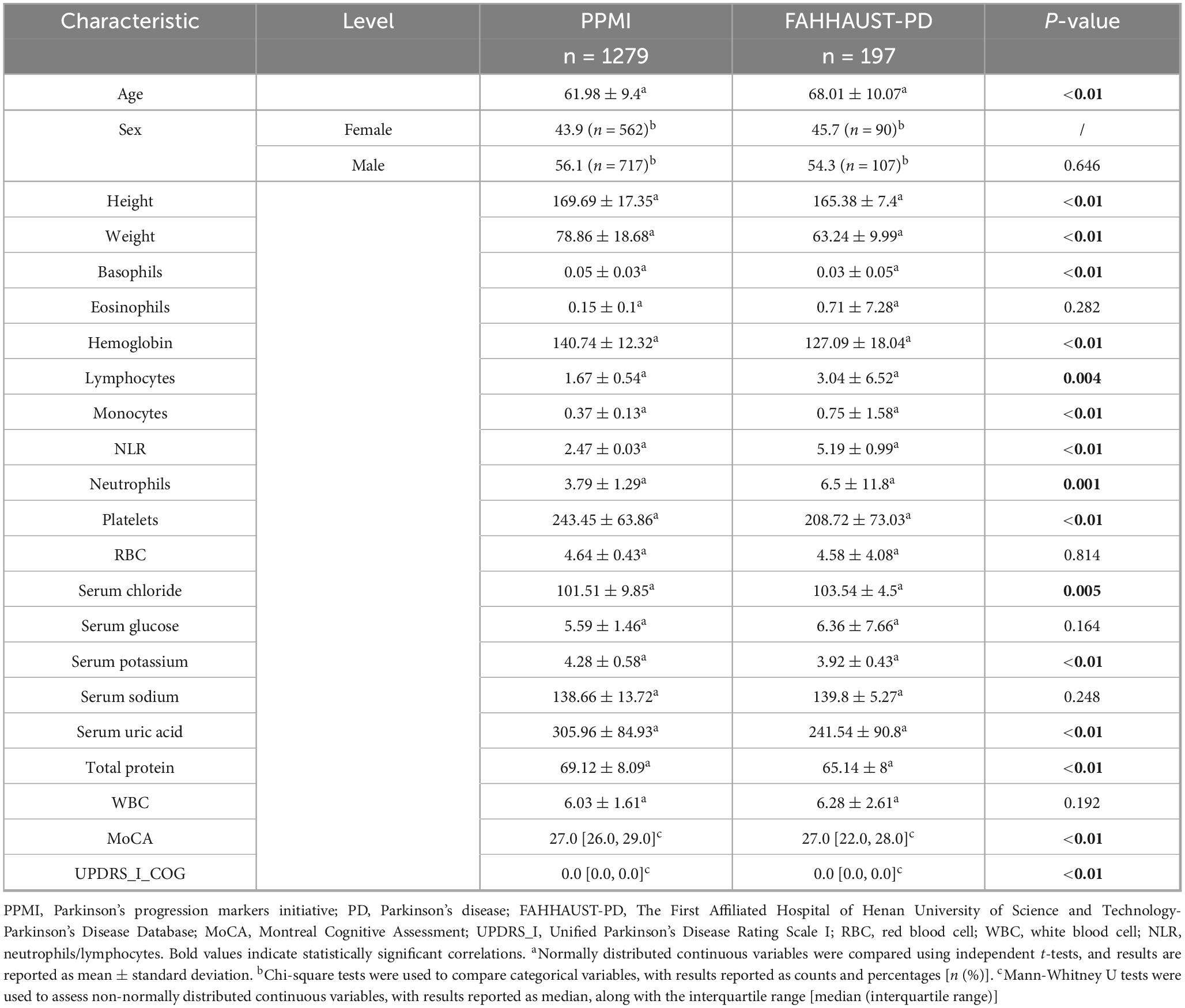 Table 1 shows the types and reasons of all included features. Comparative analysis revealed significant demographic and clinical distinctions between cohorts (Table 2). The FAHHAUST-PD cohort demonstrated an older age distribution (mean ± SD: 68.01 ± 10.07 vs. 61.98 ± 9.40 years, p < 0.01) and reduced anthropometric measures, including height (165.38 ± 7.40 vs. 169.69 ± 17.35 cm) and weight (63.24 ± 9.99 vs. 78.86 ± 18.68 kg). Inflammatory profiles diverged markedly, with elevated neutrophil-to-lymphocyte ratio (NLR: 5.19 ± 0.99 vs. 2.47 ± 0.03), neutrophil counts (6.50 ± 11.80 vs. 3.79 ± 1.29 × 109/L), and monocyte levels (0.75 ± 1.58 vs. 0.37 ± 0.13 × 109/L) in the validation cohort. Hematologic and metabolic parameters showed reduced hemoglobin (127.09 ± 18.04 vs. 140.74 ± 12.32 g/dL) and platelet counts (208.72 ± 73.03 vs. 243.45 ± 63.86 × 109/L) in FAHHAUST-PD patients.