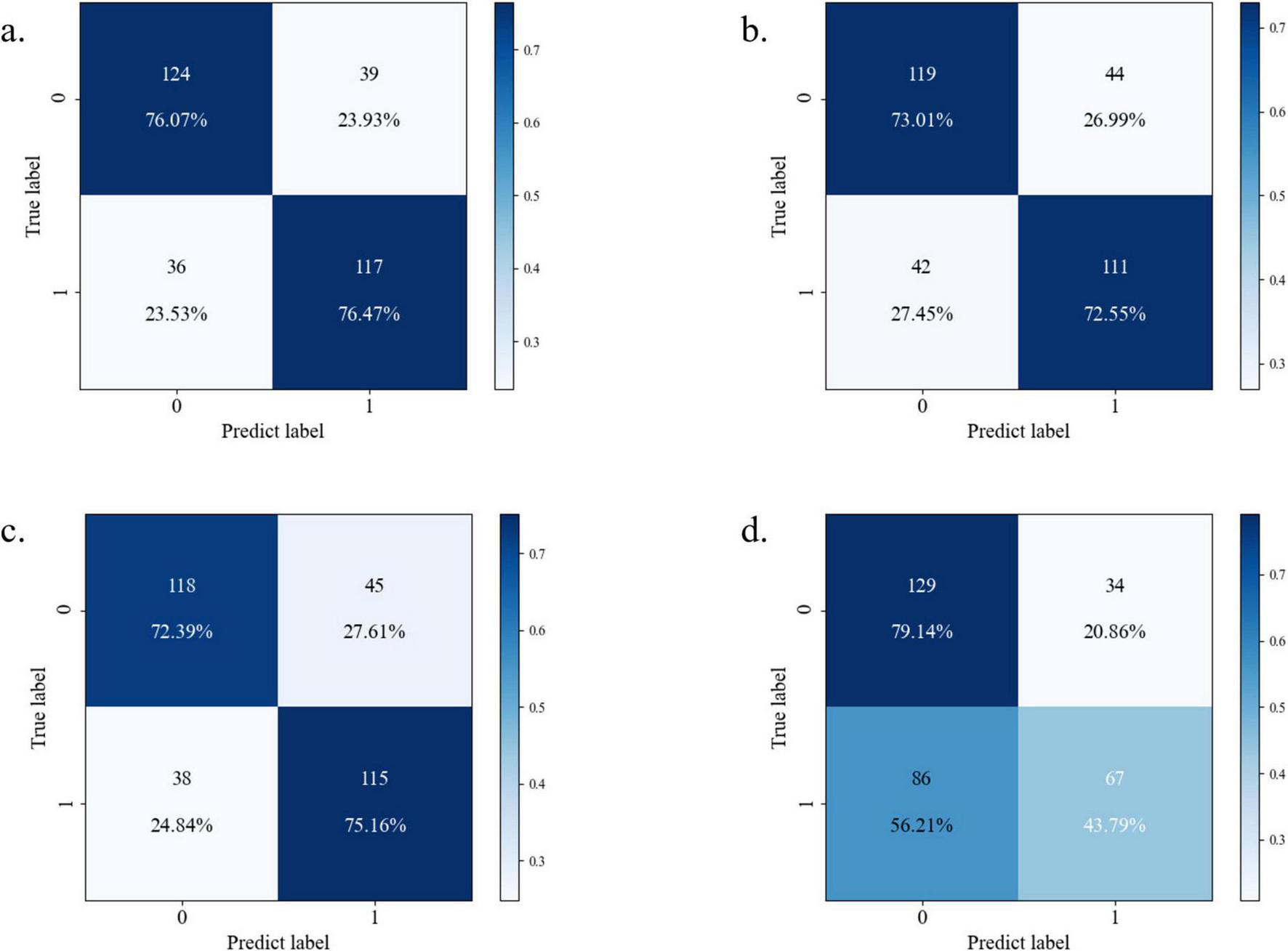 Confusion matrix analysis (Figures 6a–d) corroborated these findings, with Random Forest achieving the highest F1-score (0.76) and precision-recall balance (sensitivity = 0.76, specificity = 0.76), as detailed in Table 3. The neural network’s elevated misclassification rates (false negative rate = 0.56) further substantiated its suboptimal performance. Based on this comprehensive evaluation, the Random Forest algorithm was selected for final model deployment due to its robust discriminative capacity and interpretability advantages.