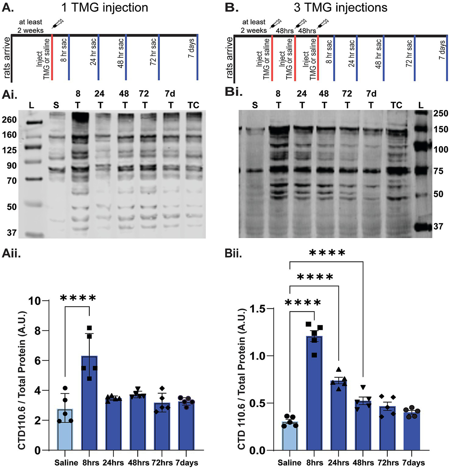 Time course of the increase in O-GlcNAcylation in whole hippocampal homogenate following in vivo TMG injection. (A) Diagram showing TMG injections (subcutaneous, s.c.) and hippocampal tissue collection using adult male Fisher rats injected with either one (A) or three (B) TMG (10 mg/kg) or saline injections. Red tick mark(s) denote when injections occurred. Blue tick marks denote when rats were euthanized post-injection: 8, 24, 48, 72 h or 7 days. (Ai,Bi; See Supplementary Figure 2 for full blots and TP). Representative Western blot (30 μg protein/lane) of O-GlcNAcylated proteins detected using the pan-O-GlcNAc antibody, CTD 110.6. Blot labeling left to right: Ladder (L), saline (S), 8 T, 24 T, 48 T, 72 T, and 7d indicate time of euthanasia in hrs or days (d) post-TMG injection. TC denotes cerebellum tissue used to normalize across blots for quantification; all lanes were normalized to this value after total protein. (Aii,Bii) Quantification of Western blots (n = 5 per group, 1 saline animal collected at each TMG timepoint, AU indicates arbitrary units). (Aii) Following a single TMG injection O-GlcNAcylated proteins are significantly increased at 8 h post-injection compared to saline-injected control rats. RMANOVA: F (5-24)=13.334, p < 0.01; pairwise comparisons: p < 0.001 at 8 h post-injection; p = 1.00 at all other post-injection times. (Bii) Results show 3 injections in a week significantly increase O-GlcNAcylation for up to 72 h after the last injection. RMANOVA: F (5,24)=71.967, p < 0.001; Pairwise comparisons: p < 0.001 at 8 h; p < 0.001 at 24 h; p = 0.008 at 48 h; p = 0.109 at 72 h; p > 1.00 at 7 days.