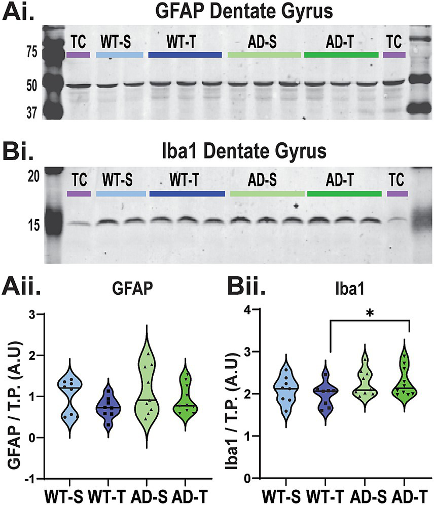 Western blot of DG does not reveal an effect of genotype or treatment on GFAP expression, while Iba-1 expression is increased in TMG-treated TgF344-AD rats. (Ai) Representative Western blot detecting GFAP (~50 kDa) protein in the DG (30 μg protein) from WT and TgF344-AD rats (See Supplementary Figure 4 for full blots and TP). (Aii) All lanes were normalized to their respective TP, and then blots were normalized using a cerebellum technical control (purple TC). AU indicates arbitrary units. No significant genotype or treatment effect on total GFAP protein in the DG [genotype effect: F (1,31)=1.433, p = 0.24; treatment effect: F (1,31)=2.913, p = 0.098; interaction effect: F (1,31)=0.56, p = 0.814]. (Bi) Representative Western blot detecting Iba-1(~15 kDa) protein in the DG (30 μg). (Bii) Significant genotype effect on Iba-1 protein in the DG [F (1,31)=4.872, p = 0.035]. While the overall interaction effect between genotype and treatment was not significant: F (1,31)=0.432, p = 0.516, Bonferroni-corrected pairwise comparisons show a significant difference between WT and AD saline-treated animals (p = 0.049); no main effect of treatment was observed [F (1,31)=0.165, p = 0.687].