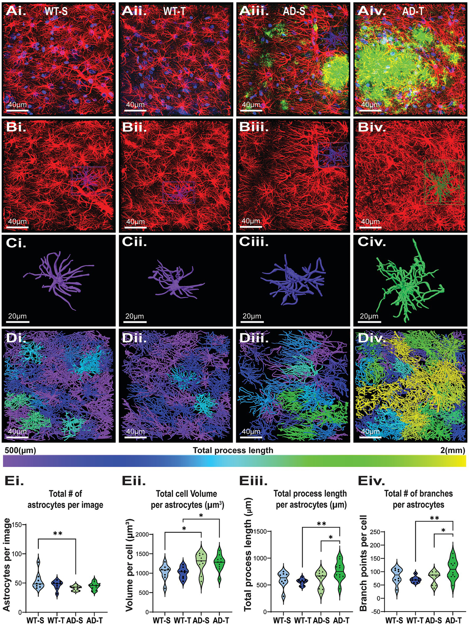Increasing O-GlcNAc increases astrocyte process length and branching in TgF344-AD rats. (Ai–Div) Representative confocal images of astrocytes in the DG from all 4 experimental groups with morphological reconstruction using Arivis (Carl Zeiss Microscopy GmbH. (2023). arivis Cloud). (Ai–Aiv) Dapi (blue), GFAP (red), Aβ (green), scale bar = 40 μm. (Bi–Biv) Images of isolated GFAP staining; scale bar = 40 μm. (Ci–Civ) Examples of individual reconstructed astrocytes. Image color based on total process length of that cell, scale bar = 20 μm. (Di–Div) Full image Arivis reconstruction; cell color based on total process length shows an increase in the number of cells with longer total process lengths (green and yellow) in TgF344-AD rats. (Ei–Eiv) Graphs quantifying morphology attributes of astrocytes in the DG. Each dot represents 1 rat with an average of 3 images per animal. Total astrocytes analyzed: 4786, with a breakdown of WT-S: 1284, WT-T: 1123, AD-S: 1083, AD-T: 1296, N = 8–10 animals per group. (Ei) Significant effect of genotype on total number of GFAP positive cells with less in TgF344-AD rats, and no effect of treatment [significant genotype effect: F (1,31)=5.561, p = 0.025; no treatment effect: F (1,31)=0.165, p = 0.687; pairwise comparisons show a significant difference between saline-treated WT and AD rats (p = 0.008)]. (Eii) Significant effect of genotype on total astrocyte volume with increased volume in TgF344-AD rats [significant genotype effect: F (1,31)=12.364, p = 0.001; no effect of treatment: F (1,31)=0.009, p = 0.926; pairwise comparisons show a significant difference between saline-treated WT and AD rats (p = 0.023) and TMG-treated WT and AD rats (p = 0.015)]. (Eiii) Significant effect of genotype on process length with longer length in TgF344-AD rats [significant genotype effect: F (1,31)=4.182, p = 0.049; No treatment effect: F (1,31)=1.341 p = 0.256. A near interaction of treatment and genotype: F (1,31)=4.033, p = 0.053]. Pairwise comparisons show a significant difference between TMG-treated WT and AD rats (p = 0.007), as well as a significant increase between TMG-treated and saline-treated TgF344-AD rats (p = 0.026). (Eiv) While we observed no effect of genotype or treatment alone we did see a significant genotype x treatment interaction for number of branches, with TMG-treated TgF344-AD rats having more branches than TMG-treated WT rats [Genotype effect: F (1,31)=2.857, p = 0.101; Treatment effect: F (1,31)=1.124, p = 0.297; Genotype X treatment effect: F (1,31)=6.079, p = 0.019]; pairwise comparisons reveal a significant difference between TMG-treated WT and TgF344-AD rats, with AD-T cells having significantly more branches than WT-T (p = 0.006) as well as a significant increase in the number of branches in AD-T compared to AD-S (p = 0.014).