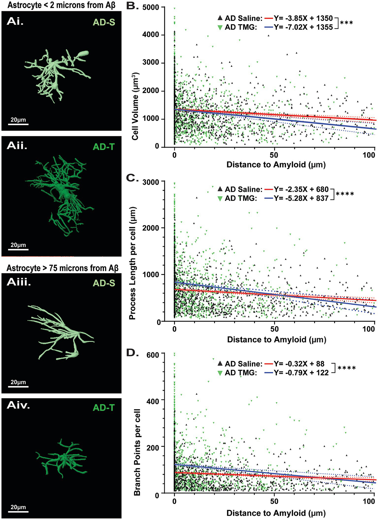Pharmacologically increasing O-GlcNAc modulates astrocyte complexity based on proximity to Aβ plaques. (Ai,Aii) Reconstructed images of astrocytes in TgF344-AD rats located less than 2 μm from an Aβ plaque. (Aiii,Aiv) Reconstructed images of astrocytes located at least 75 μm from an Aβ plaque, scale bars = 20 μm. (B) Linear regression showing relationship between cell volume and distance to the nearest Aβ plaque (Saline (red line): y = −3.845X + 1,351 vs. TMG (black line) y = −7.015X + 1,355; p = 0.0095). (C) Linear regression showing relationship between total cell process length and distance to the nearest Aβ plaque (Saline: y = −2.3458X + 681.1 vs. TMG y = −5.278X + 837.2; p = 0.0004). (D) Linear regression showing relationship between total cell branch points and distance to the nearest Aβ plaque (Saline: y = −0.3116X + 88.13 vs. TMG y = −0.7851X + 122.8; p = 0.0009). Across all parameters examined, analyses reveal significantly different linear models between saline and TMG-treated animals, indicating that TMG treatment differentially impacts the relationship between astrocyte complexity and distance to Aβ. Regression plots for linear regressions in Supplementary Figure 5.