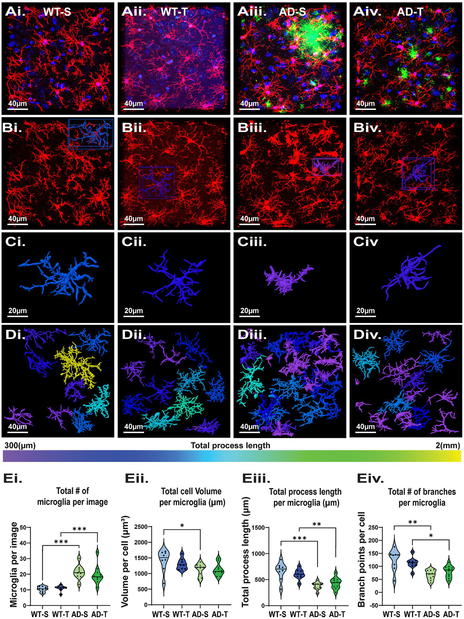 Microglia: To assess the morphology of microglia, 3 z-stacks of anti-Iba-1-stained microglia (staining protocol above) from the inner hilus of the DG were imported into Arivis software and reconstructed into a 3-D model. A software pipeline was then created to identify DAPI and Iba-1 co-localization to accurately detect the cell body of microglia. A semi-automated approach was then used to reconstruct cells using the Probabilistic reconstruction algorithm in NeuronTracer. Tubularity sensitivity and local threshold were determined from the image, and seed filter set to 70%. The total number of cells within a field, as well as cell volume, total process length, and branch point number were exported. For each animal, we took the average of all microglia from 3 images to produce average cell values (total microglia analyzed: 1686, WT-S: 252, WT-T: 267, AD-S: 576, AD-T: 591). To assess if differences in microglia morphology characteristics were related to distance from Aβ plaques, we first measured both independently. Next, the distance from each microglia to the nearest Aβ plaque was measured in Arivis software and plotted in GraphPad.