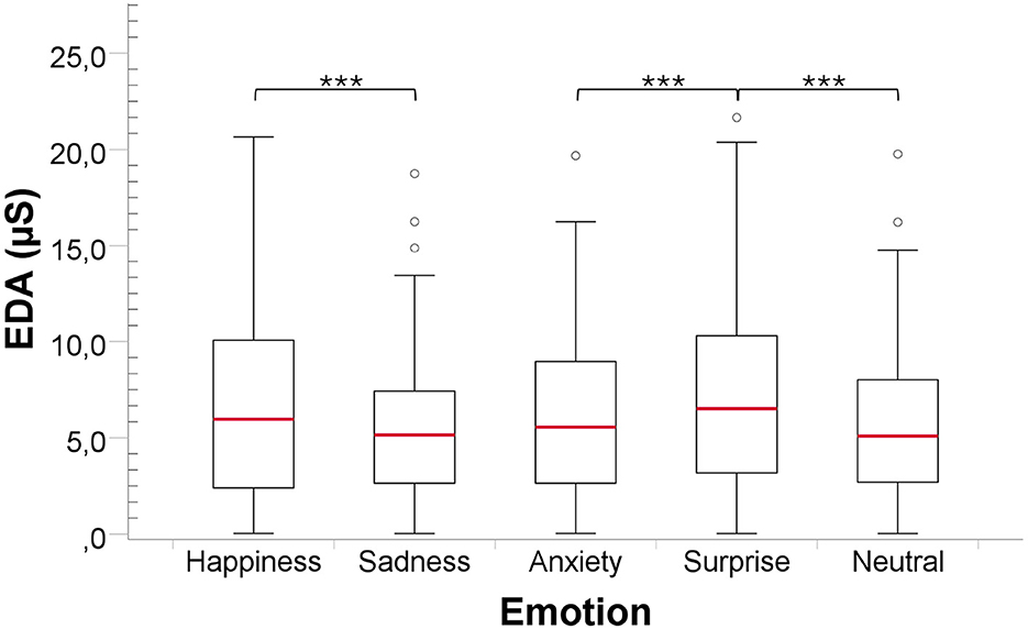 For EDA, the Friedman test revealed a significant difference among the five emotions [Fr(4) = 27.18, P value < 0.001, Cohen′s f≈0.43], indicating a large effect size. Post-hoc power analysis based on the observed effect size indicated sufficient power to detect this effect (power≈1.00). Pairwise comparisons (Figure 1) showed that the EDA average for Happiness was significantly higher than Sadness (P value < 0.001, r = 0.639), Surprise was significantly higher than Anxiety (P value < 0.001, r = 0.718) and Neutral (P value < 0.001, r = 0.736).