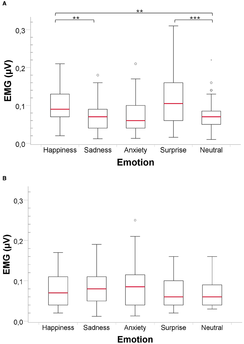 Finally, for the EMG corrugator, the Friedman test revealed a significant difference between the five emotions [Fr(4) = 10.54, P value < 0.05, Cohen′s f≈0.27], indicating a small-to-medium effect size. Post-hoc power analysis indicated sufficient power to detect this effect (power≈0.99). However, pairwise comparisons did not reveal any significant differences across the pairs of emotions (see Figure 2B).