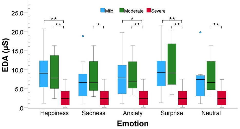 For EDA (Figure 3), the One-Way ANOVA test revealed significant differences between the three AD severity levels for all emotions: Happiness [F(2, 33) = 7.75, P value < 0.01, Cohen′s f≈0.69, power≈0.95], Sadness [F(2, 33) = 5.40, P value < 0.01, Cohen′s f≈0.89, power≈1.00], Anxiety [F(2, 33) = 6.47, P value < 0.01, Cohen′s f≈0.62, power≈0.90], Surprise [WelchF(2, 18.52) = 13.15, P value < 0.01, Cohen′s f≈0.72, power≈0.97] and Neutral [F(2, 33) = 5.52, P value < 0.01, Cohen′s f≈0.58, power≈0.85]. Pairwise comparisons revealed significant differences between the Mild and the Severe levels for Happiness (P value < 0.01, r = 0.60), Anxiety (P value < 0.05, r = 0.54) and Surprise (P value < 0.05, r = 0.58), and between the Moderate and Severe levels for Happiness (P value < 0.01, r = 0.58), Sadness (P value < 0.05, r = 0.55), Anxiety (P value < 0.01, r = 0.57), Surprise (P value < 0.01, r = 0.63) and Neutral (P value = 0.01, r = 0.57).