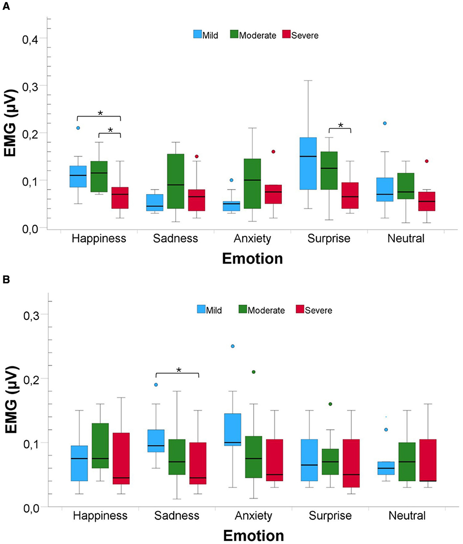 Finally, for the EMG corrugator muscle (Figure 4B), the Kruskal–Wallis test only revealed a significant difference between the three severity levels for Sadness [H(2) = 6.48, P value < 0.05, Cohen′s f≈0.40, power≈0.53]. The pairwise comparison revealed a significant difference between the Mild and Severe levels of AD severity (P value < 0.05, r = 0.42).
