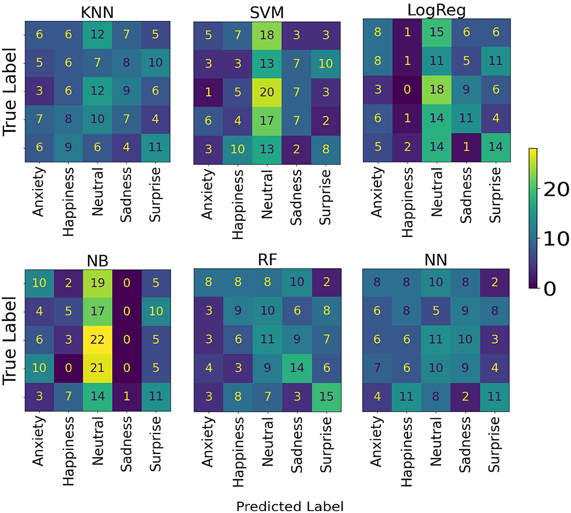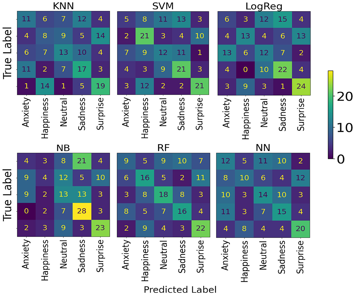 For Dataset B, the results obtained are shown in Table 2. The model with the best accuracy for predicting emotional content in music among AD patients was RF, with an average accuracy of 32.22% (95% CI: 25.50–38.95). The models' confusion matrices are shown in Figure 6.