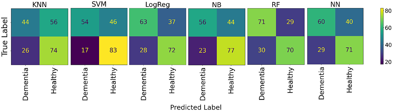 The results of distinguishing between healthy and AD participants are shown in Table 3. The RF model achieved the highest average accuracy of 70.50% (95% CI: 57.55–83.45) in distinguishing between healthy and AD participants. The confusion matrices for these models are shown in Figure 7.