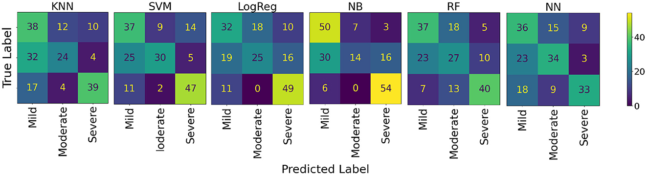 The results obtained to assess AD severity among AD participants are shown in Table 4. The NB was the best model for distinguishing between mild, moderate, and severe dementia, with an average accuracy of 65.56% (95% CI: 50.41–80.70). The confusion matrices for these models are shown in Figure 8.
