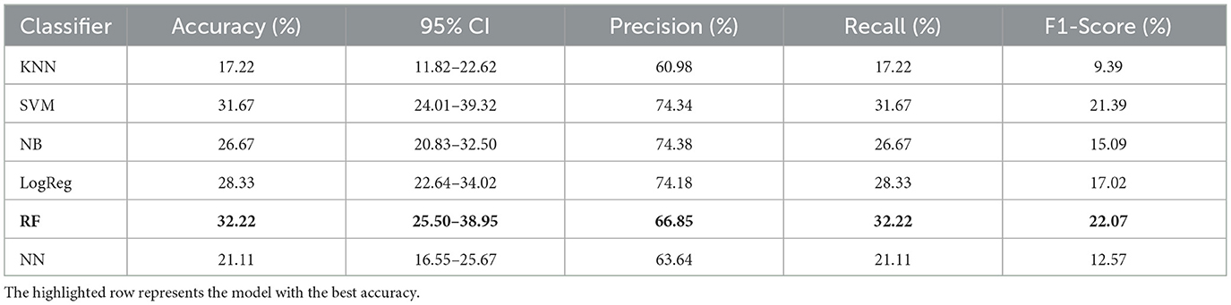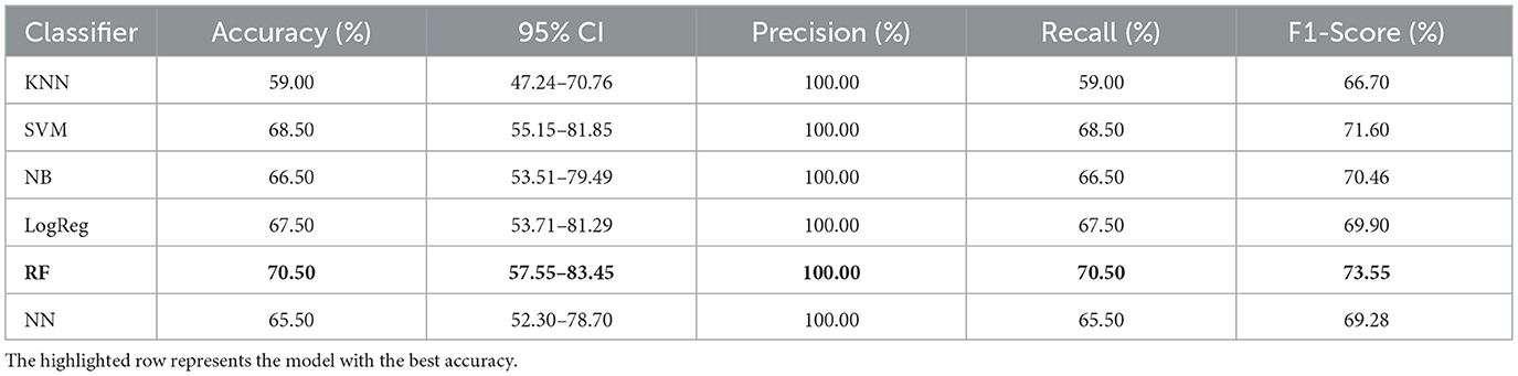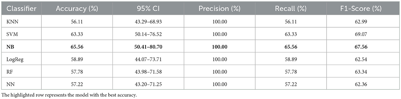 The classifiers considered were as follows: K-Nearest Neighbors (KNN), SVM, Logistic Regression (LogReg), Naïve Bayes (NB), RF, and Neural Networks (NN)—Multi-Layer Perceptron (MLP). These classifiers were chosen based on their proven effectiveness and complementary strengths in classification tasks. KNN offers a simple, instance-based approach suitable for datasets with non-linear class boundaries. SVMs are robust classifiers that perform well in high-dimensional spaces and effectively handle non-linear relationships. LogReg provides a computationally efficient, interpretable baseline for binary classification problems. NB leverages probabilistic assumptions to deliver fast and often reliable results, especially when features are conditionally independent. RF is an ensemble method for handling noisy, high-dimensional data while reducing overfitting. Lastly, NNs capture complex nonlinear patterns across multiple layers, offering flexibility and powerful modeling capabilities. These models have all been widely used in related domains and provide a balanced spectrum of algorithmic complexity, interpretability, and predictive performance (Zhu et al., 2020; So et al., 2017; Vapnik, 1998; Breiman, 2001; Jain et al., 1996; Pedregosa et al., 2011; Gupta and Kahali, 2020).