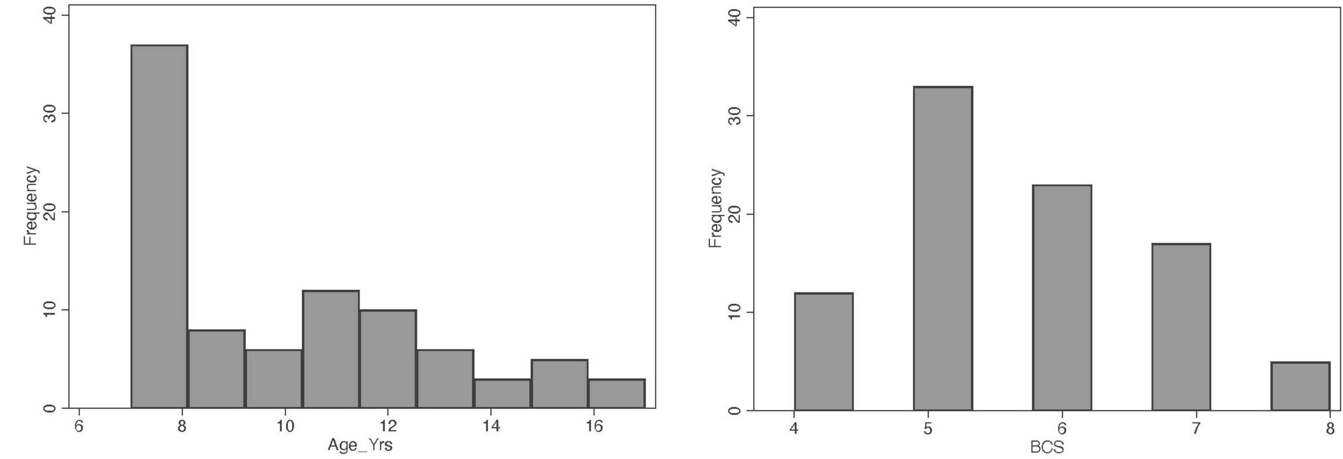 Figure 1. Distribution of the variables age and body condition score (BCS) in the population of cats studied.