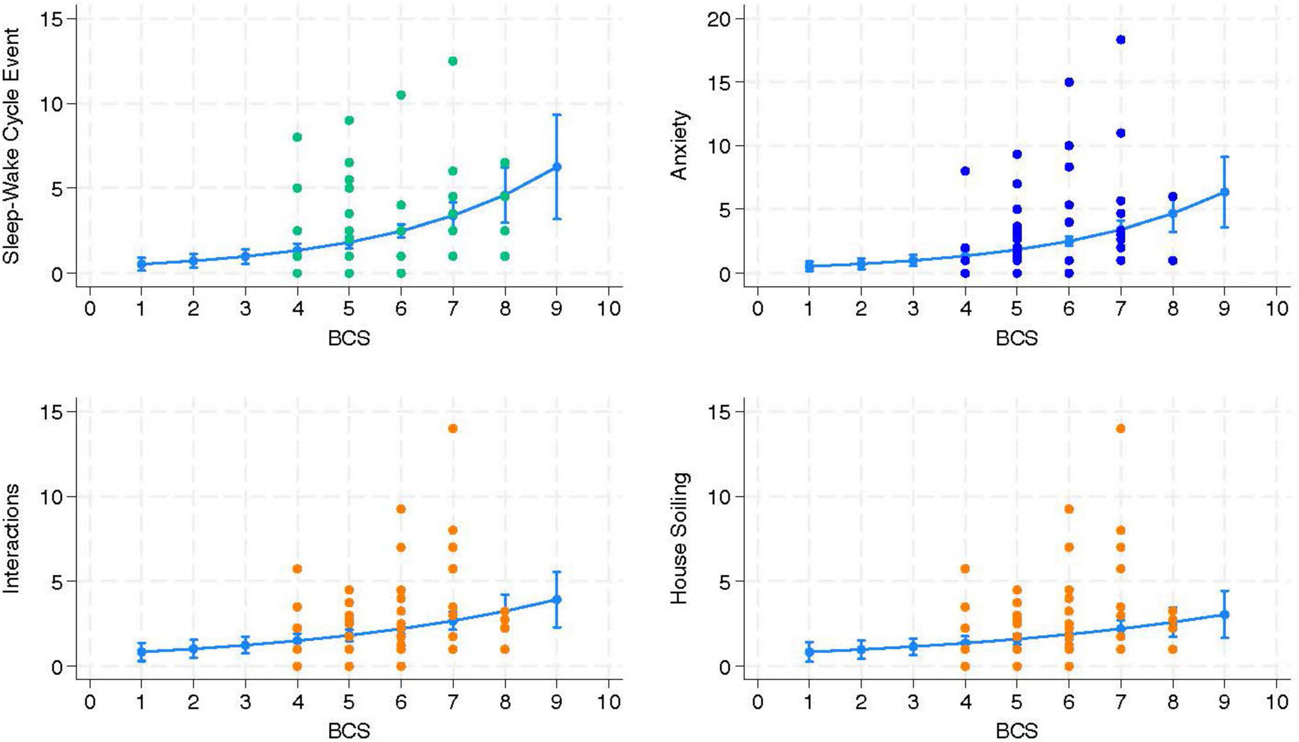 Four scatter plots depict relationships between BCS (Body Condition Score) and different behavioral factors. Top left: Sleep-Wake Cycle Event; top right: Anxiety; bottom left: Interactions; bottom right: House Soiling. Each plot shows data points with trend lines, indicating a positive correlation between BCS and the variables.