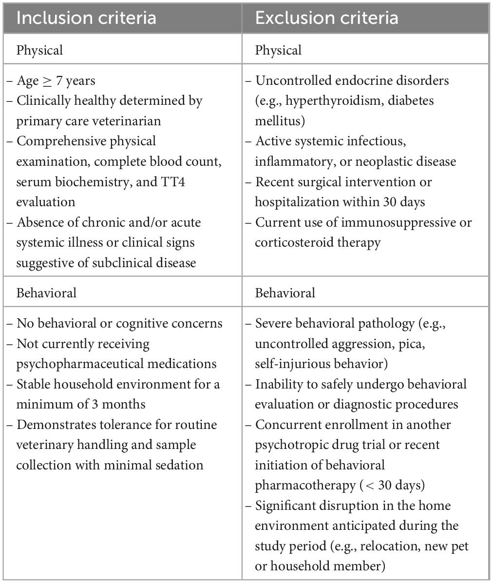 An extensive pre-screening protocol was implemented for all potential participants. Caregivers completed a detailed pre-screening questionnaire to gather historical and current medical and behavioral information and identify known pre-existing medical conditions or clinical signs of disease (see Supplementary Document 1). Cats meeting the inclusion criteria (Table 1) proceeded to the next stage, the medical evaluation.