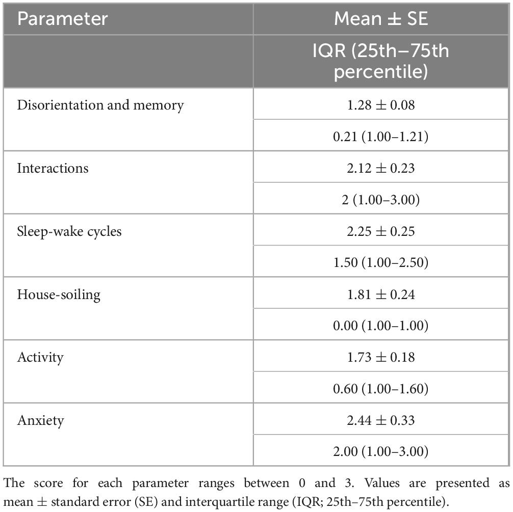 Table 2. Descriptive statistics of the Feline Cognitive Dysfunction Rating Chart (FCDRC) severity scores (n = 85 cats).
