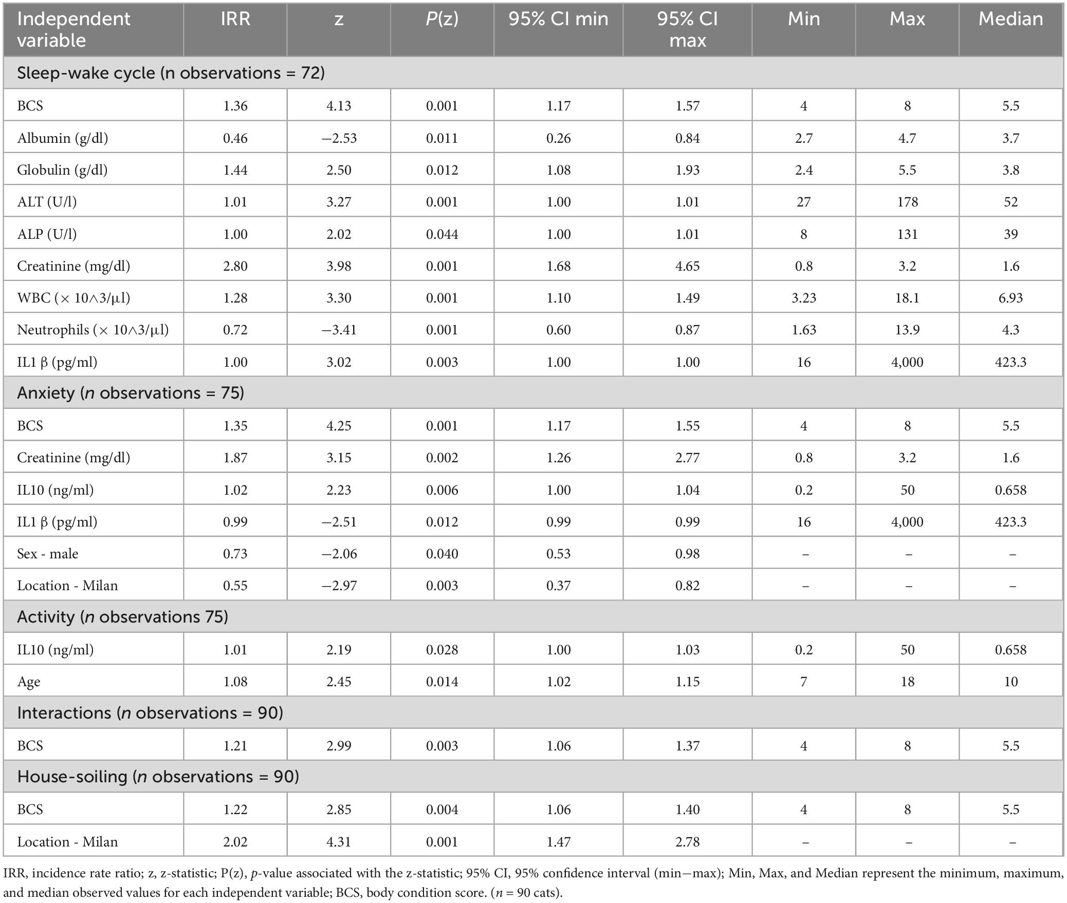 Several independent variables showed a trend of association (P < 0.2) in the Spearman rank analysis. Based on these correlations, we included the variables sex, age, and location of data collection in the Lasso Poisson regression models as confounding factors. The following variables were included in the regression models as predictors: body condition score (BCS), IL-1β, blood urea nitrogen (BUN), creatinine, alanine aminotransferase (ALT), aspartate transferase (AST), alkaline phosphatase (ALP), albumin, globulin, total white blood cells (WBC), neutrophils, lymphocytes, and total T4.