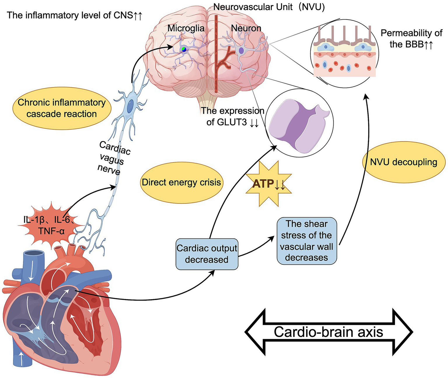 Insufficient cerebral blood flow leads to neuronal energy metabolism disorders, and chronic inflammation activates microglia through cytokines, causing CNS inflammation. These two factors intertwine, forming a vicious cycle: low perfusion exacerbates inflammation and oxidative stress, which in turn further impairs vascular regulatory function, disrupts energy metabolism, and ultimately plays an important role in the occurrence and development of PND in the heart-brain axis (Figure 5).