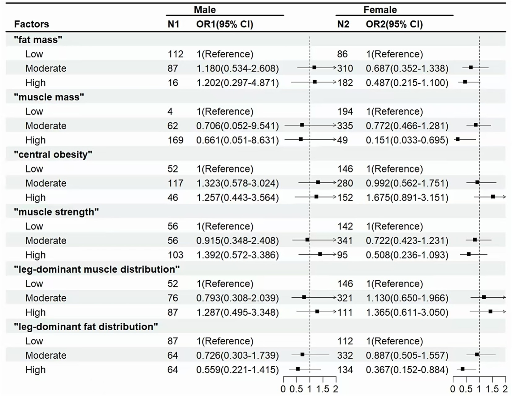 Figure 4 shows that in the female population, “muscle mass” (OR for high level: 0.151 [0.033–0.695]) and “leg-dominant fat distribution” (OR for high level: 0.367 [0.152–0.884]) were associated with a lower incidence of cognitive decline.