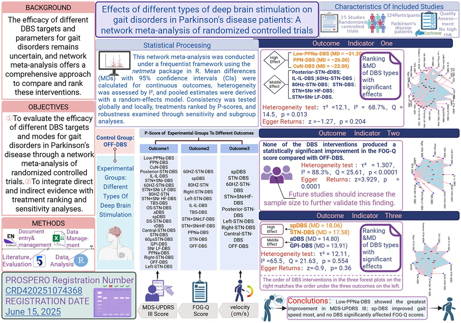 Conclusion: This network meta-analysis systematically compared the effects of different DBS modalities on gait disorders in PD. For MDS-UPDRS Part III, Low-PPNa-DBS, PPN-DBS, and CuN-DBS yielded the most pronounced and statistically robust improvements. In contrast, analysis of FOG-Q scores revealed no statistically significant effects for any DBS intervention. Regarding gait speed, spDBS and STN-DBS showed clear and significant enhancements.