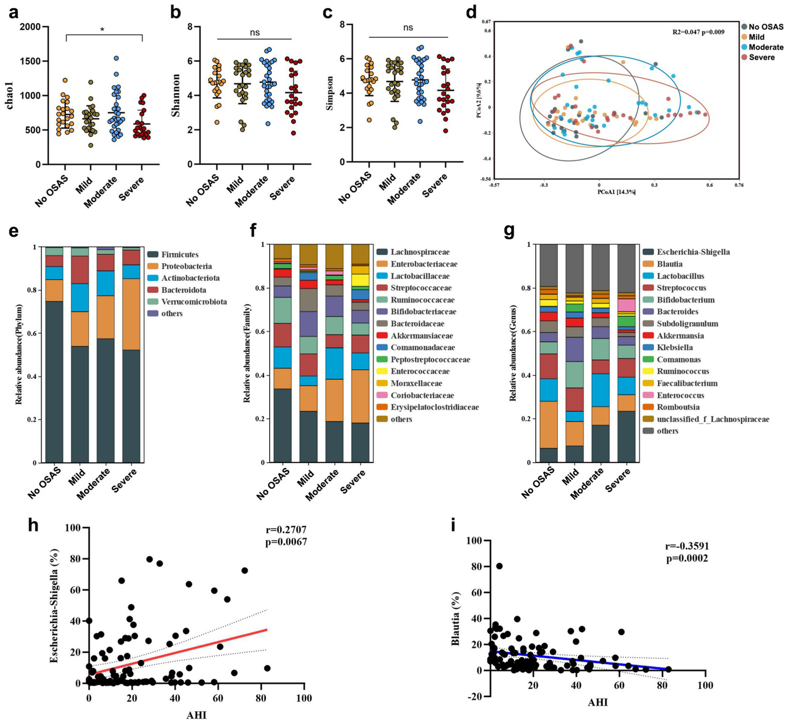 The gut microbiota features in sICAS patients with different severity of OSAS. The α-diversity index (a) chao1, (b) Shannon index, and (c) Simpson index (verall differences were assessed using the Kruskal–Wallis test followed by Dunn’s multiple-comparison post-test when appropriate). (d) Principal coordinate analysis (PCoA) of the gut microbiota composition based on Bray-curtis distance. The gut microbiota composition at (e) phylum level, (f) family level, and (g) genus level. Spearman’s correlations between AHI and the abundances of (h)Eschericha-Shigella and (i)Blautia. Statistical annotations: ns, not significant; *p < 0.05.