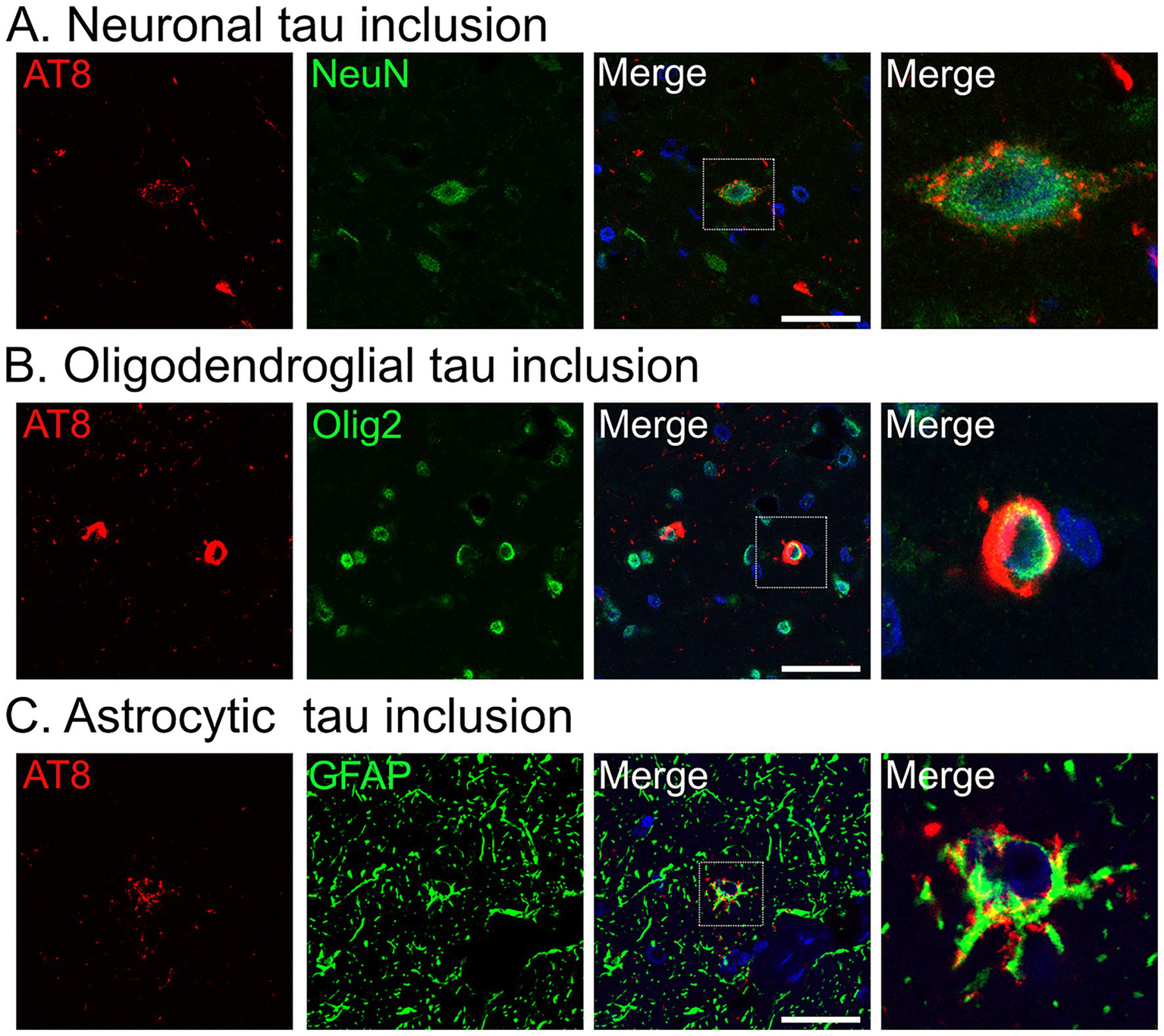 Confocal imaging revealed that tau aggregates accumulated in neurons (Figure 5A) and oligodendrocytes (Figure 5B). In addition, a subset of tau inclusions observed in DAB-stained sections (Figures 4G–I) was confirmed to be localized within astrocytes, as demonstrated by co-localization of AT8 and GFAP (Figure 5C).