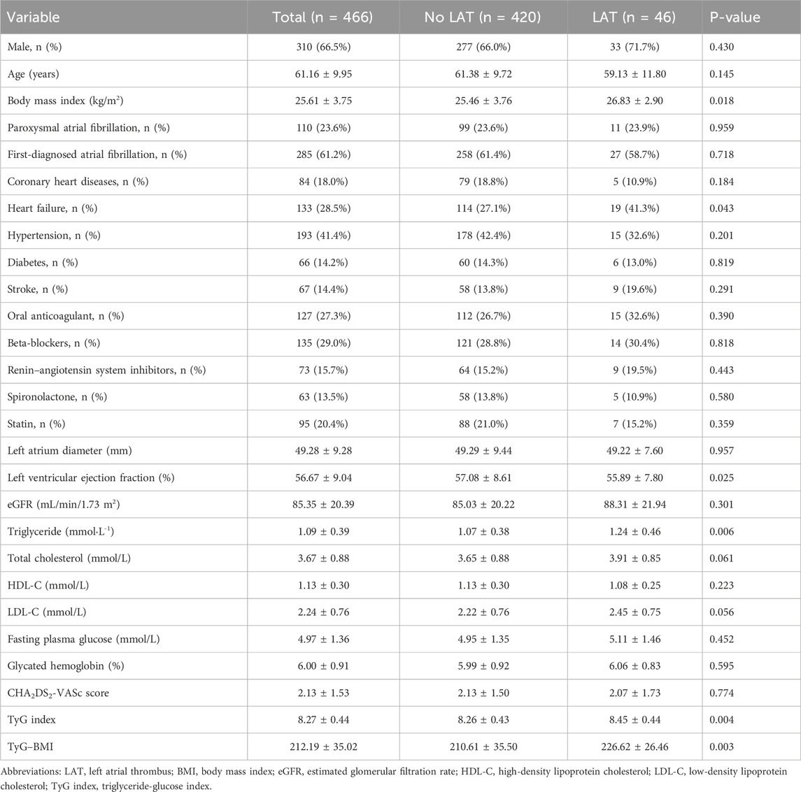 The triglyceride-glucose (TyG) index and the triglyceride-glucose–body mass index (TyG–BMI) are easily accessible surrogate markers of insulin resistance. Several studies have provided robust evidence that these indices are associated with the development and prognosis of cardiovascular disease, including AF (Lo et al., 2023; Cui et al., 2024; Azarboo et al., 2024). However, the predictive value of the two surrogate insulin resistance indices for LAT in patients with nonvalvular atrial fibrillation (NVAF) remains unknown. Accordingly, we conducted this study to investigate the association between insulin resistance indices and LAT in patients with NVAF who are undergoing transesophageal echocardiography (TEE).