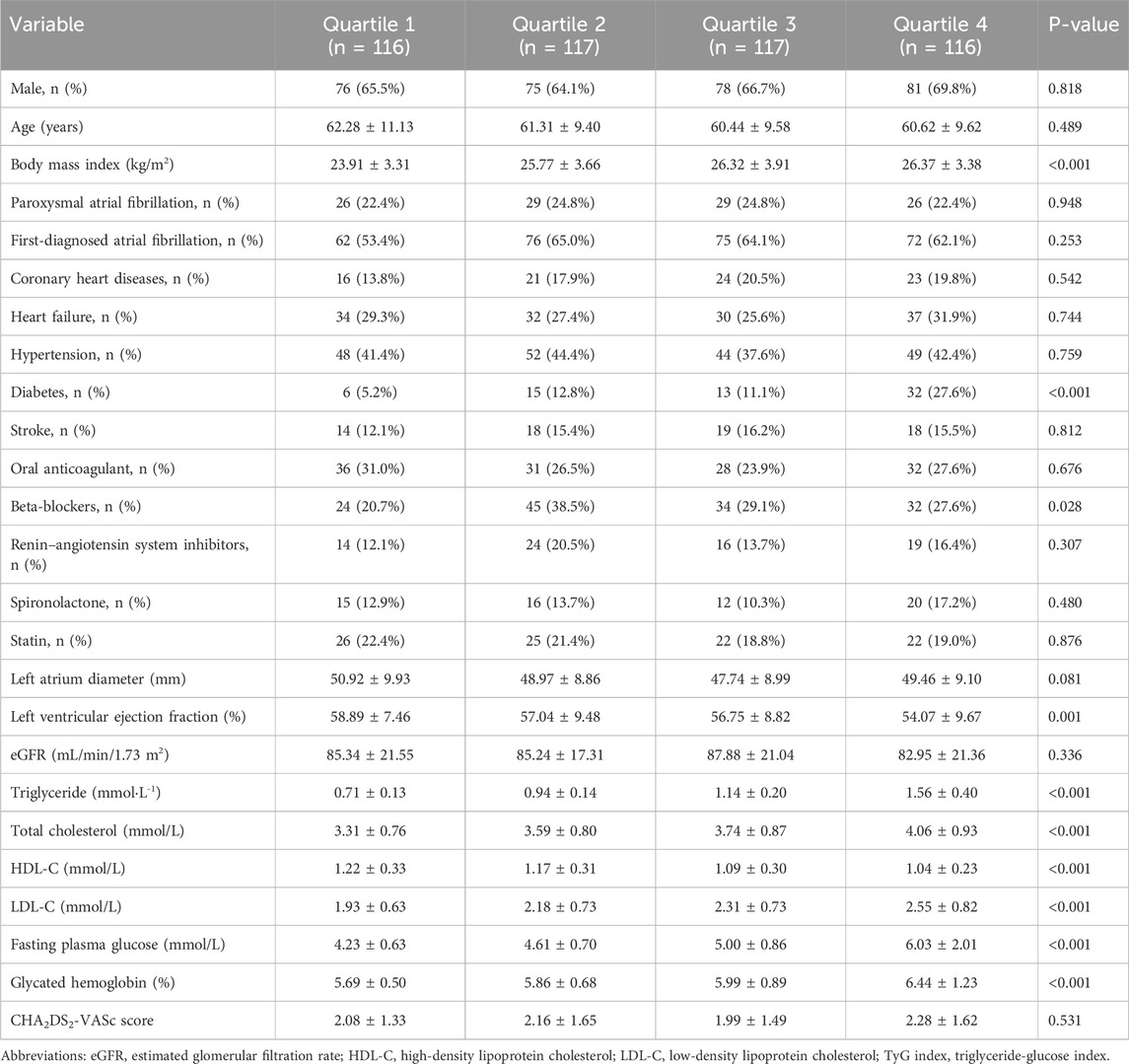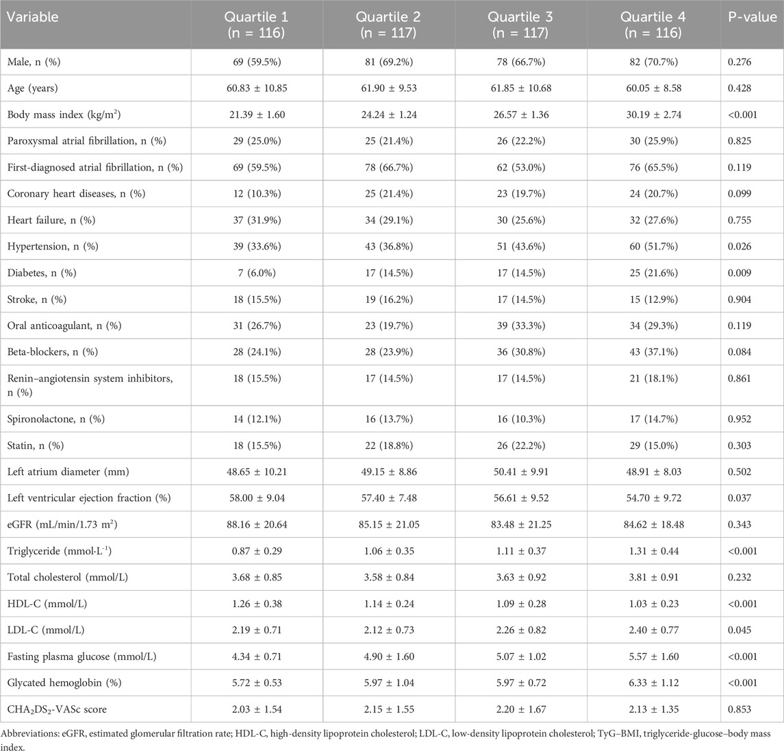 The medians (interquartile ranges) of the TyG index and TyG–BMI were 8.25 (7.99, 8.54) and 209.97 (186.35, 234.21), respectively. Table 2, Table 3 demonstrate the baseline characteristics of patients according to the baseline TyG index quartiles and TyG–BMI quartiles, respectively. Participants with higher quartiles of TyG index or TyG–BMI were more likely to have higher BMI, higher proportion of history of diabetes, lower LVEF, higher levels of triglycerides, low-density lipoprotein cholesterol (LDL-C), fasting plasma glucose, glycated hemoglobin, and lower level of high-density lipoprotein cholesterol (HDL-C). Patients with higher quartiles of TyG–BMI were also more likely to have a higher history of hypertension.