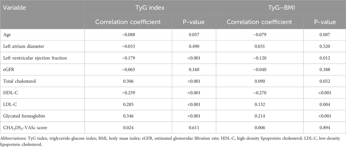 Correlation analysis revealed significant but generally weak associations (Table 4). Both the TyG index and TyG–BMI showed positive correlations with LDL-C (TyG: r = 0.285, p < 0.001; TyG–BMI: r = 0.132, p = 0.004) and glycated hemoglobin (TyG: r = 0.346, p < 0.001; TyG–BMI: r = 0.214, p < 0.001). Conversely, negative correlations were observed for both the indices with LVEF (TyG: r = −0.179, p < 0.001; TyG–BMI: r = −0.120, p = 0.012) and HDL-C (TyG: r = −0.259, p < 0.001; TyG-BMI: r = −0.270, p < 0.001). Notably, only the TyG index exhibited a significant positive correlation with total cholesterol (r = 0.306, p < 0.001).