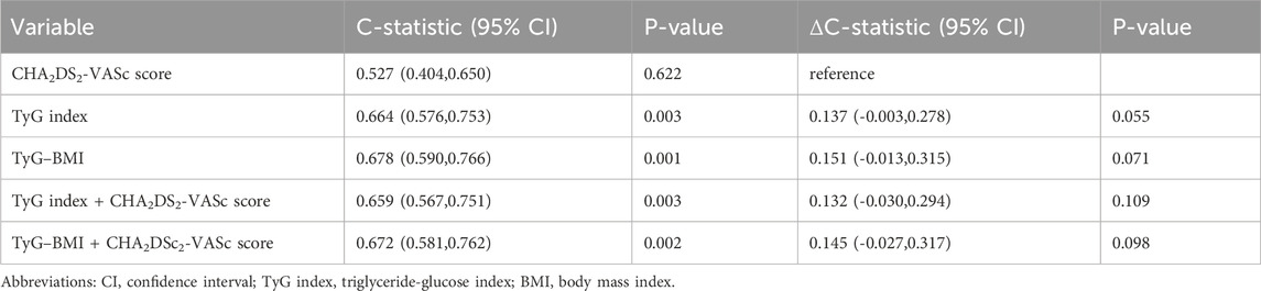 In patients receiving no anticoagulant at admission, despite the inability to predict LAT by CHA2DS2-VASc score (C-statistic: 0.527, 95% CI: 0.404–0.650, p = 0.746) alone, the TyG index incorporated into the CHA2DS2-VASc score (C-statistic: 0.659, 95% CI: 0.567–0.751, p = 0.003) and TyG–BMI incorporated into the CHA2DS2-VASc score (C-statistic: 0.672, 95% CI: 0.581–0.762, p = 0.002) were still associated with risk of LAT. However, the difference in the predictive ability between the two composite schemes and the CHA2DS2-VASc score alone did not reach statistical significance (p = 0.109 and 0.098, respectively; Table 6).
