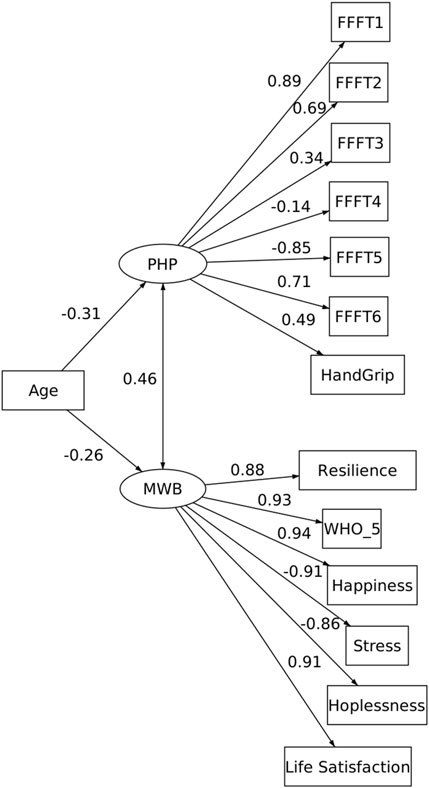 Figure 1. Structural equation model (SEM) of physical performance (PHP) and mental wellbeing (MWB) in older adults. PHP was modeled as a latent factor indicated by seven objective measures from the Fullerton Functional Fitness Test (FFFT1–6) and handgrip strength, while MWB was modeled as a latent factor indicated by six subjective measures (resilience, WHO-5 wellbeing, happiness, perceived stress, hopelessness, and life satisfaction). Standardized factor loadings and path coefficients are displayed. Age was included as a covariate of both latent factors, with an age-adjusted latent correlation estimated between PHP and MWB.