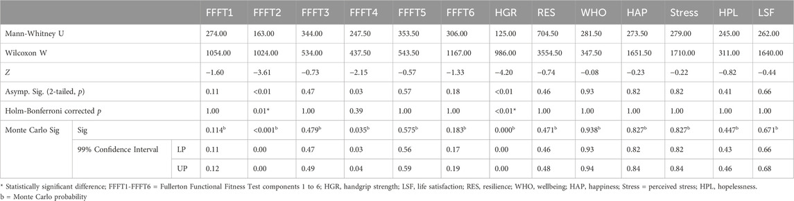 Despite the significant difference in the gender ratio, we needed to examine whether we should control for potential gender differences. Therefore, we examined gender differences in all 11 dependent measures using Mann-Whitney nonparametric tests, supplemented with Monte Carlo simulations based on 10,000 sampled tables to enhance the accuracy and robustness of the calculated p-values. To account for Type I errors resulting from multiple tests, we employed the Holm-Bonferroni correction (Holm, 1979). The emerging results indicated that the genders differed only in upper body strength (FFFT2) and handgrip force (HGR), two natural physical differences between males and females. Specifically, the genders did not differ on any of the six psychological measures. Therefore, we did not control for gender in the subsequent statistical tests. The results of the Mann-Whitney tests, which served only as control measures, are illustrated in Table 1.