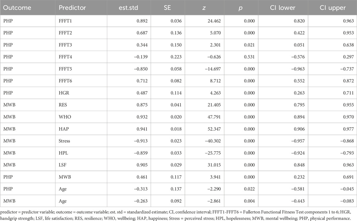 Why might the PHP–MWB association be only moderate? Beyond measurement coverage (our model captures a subset of physical and psychological domains), unmeasured psychosocial resources (e.g., social support, perceived control/self-efficacy), lifestyle factors (such as sleep regularity and daily activity patterns), and health comorbidities can independently shape MWB, thereby diluting the bivariate link with functional performance. In addition, state–trait variability in mood and stress at assessment can attenuate cross-sectional associations even when the underlying relationship is meaningful. These considerations align with recent systematic reviews and meta-analyses, which typically report small to moderate associations under controlled design conditions (Noetel et al., 2024; White et al., 2024). In addition, observational and meta-analytic evidence linking functional strength with depressive symptoms in mid-to late life commonly yields inverse but non-large effects, consistent with our pattern (Zasadzka et al., 2021; Sun and Liu, 2024).
