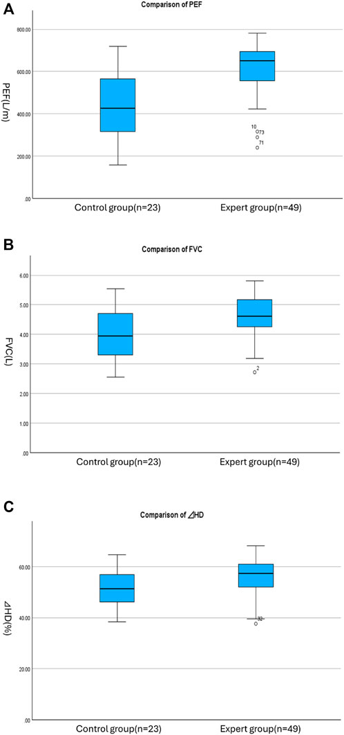 To confirm the consistency of the three repeated measurements of MPT, ⊿HD, PEF, FEV1.0, and FVC, ICCs were calculated. The results showed high consistency across all measurement items. Specifically, the ICCs were as follows: MPT (ICC = 0.952, 95% CI [0.930–0.969]), ⊿HD (ICC = 0.771, 95% CI [0.771–0.850]), PEF (ICC = 0.948, 95% CI [0.923–0.966]), FEV1.0 (ICC = 0.902, 95% CI [0.855–0.936]), and FVC (ICC = 0.966, 95% CI [0.950–0.978]). Although potential learning effects and fatigue across the three functional tests were assumed, the standardized differences (Cohen’s d) were all small (<0.5; Cohen’s d = −0.29, −0.04, −0.19, −0.21, −0.37). Even when statistically significant differences were observed, their effects were judged not to be clinically meaningful. Based on this high consistency, the small effect sizes, and the international guideline recommendations (ATS/ERS) to adopt the maximum value from multiple measurements (Graham et al., 2019), we concluded that the use of maximum values in this study was appropriate.