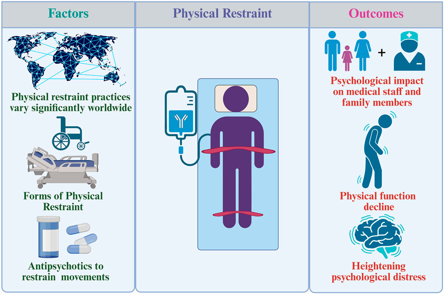 The use of physical restraints in the elderly poses serious health risks, including muscle atrophy, pressure ulcers, and falls, which significantly affect mobility and physical function; prolonged restraint worsens these issues and increases the likelihood of complications such as infections and hospitalization, while also heightening psychological distress, thus diminishing the quality of life (Meade et al., 2020; Li B. et al., 2022). Physical restraints have a direct negative impact on functional independence, as they significantly limit mobility and, in turn, reduce an individual’s ability to perform self-care tasks such as feeding, toileting, and dressing. When physical function deteriorates due to the use of restraints, individuals become increasingly dependent on others for basic activities of daily living (ADL). Research indicates that irreversible declines in the ability to perform ADL can occur after just 72 h of continuous restraint use, highlighting the urgent need to reconsider the use of restraints in care settings to preserve the autonomy and functional capabilities of individuals (Soeno et al., 2021; Foebel et al., 2016). The physical restraints imposed on patients can also have significant psychological effects on healthcare professionals and family members alike. The first issue is the moral dilemma, where individuals are fully aware that the constraints imposed may be harmful, yet they feel compelled to enforce them, which can ultimately lead to feelings of professional burnout; the second issue arises from decision-making pressure, where the demands of family members for constraints conflict with the autonomy of the patient, resulting in heightened anxiety; finally, the third issue stems from a sense of helplessness caused by a lack of adequate training, leaving individuals feeling unprepared and overwhelmed in their roles (Kong et al., 2017; Kavumpurath et al., 2023).